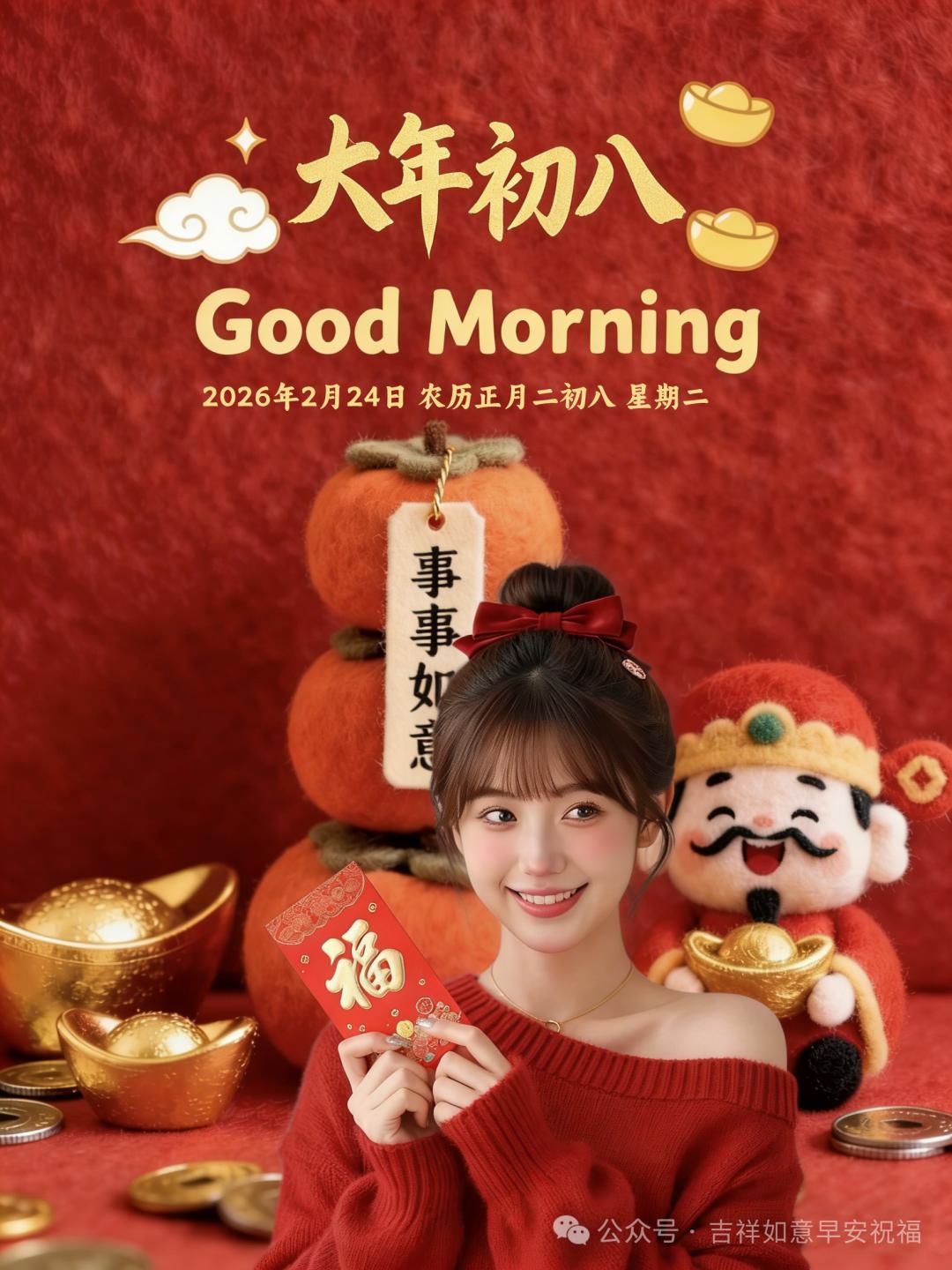 初八日子樂洋洋,送上祝福意綿綿。開工大吉財門開,事業騰飛家更圓。身心康泰最珍貴,平安幸福笑開顏。吉祥如意神采揚,朋友們歲歲紅火。