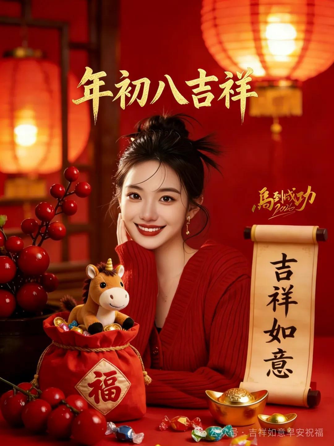 初八到來喜眉梢,歡歡喜喜過馬年。紅紅火火走好運,財星高照路寬寬。閤家團圓福滿滿,事業騰飛步步高。初八祝福送給你,吉祥如意迎春天! .
