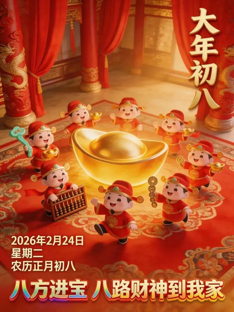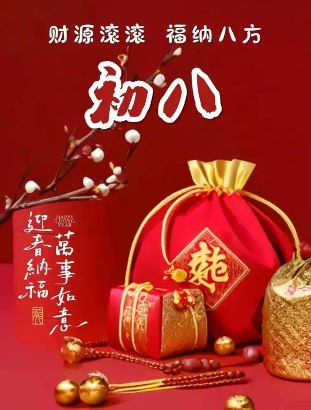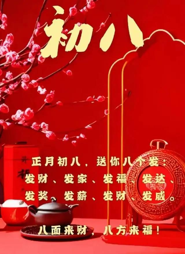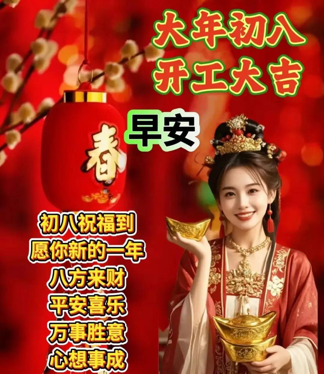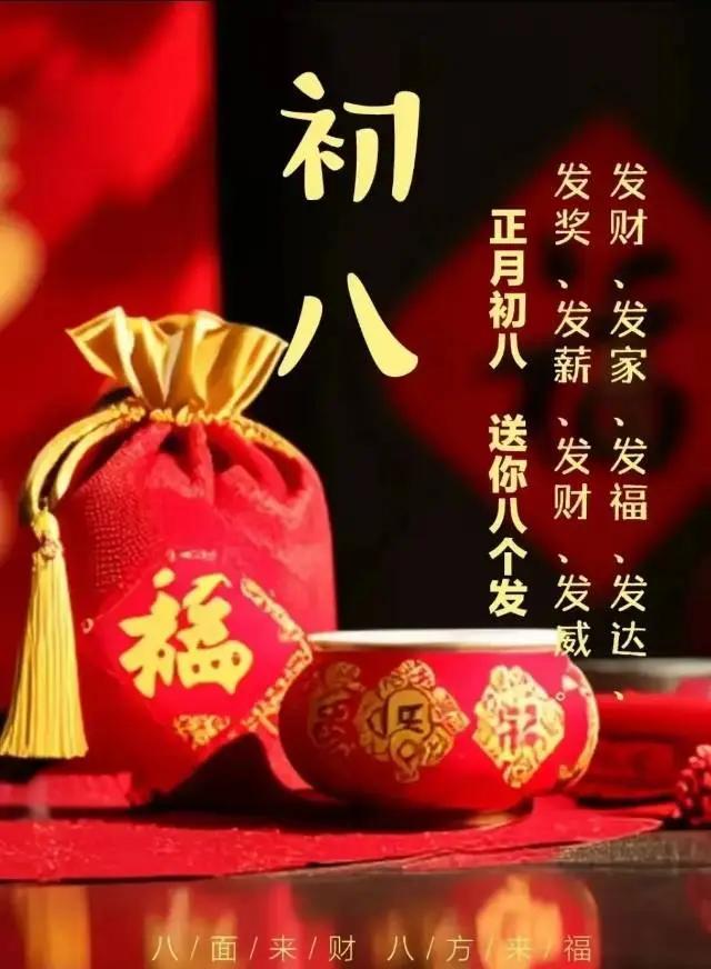 - 大年初八,八方來財,八方來福。願你的財運如江河奔騰,源源不斷;福氣如星辰閃爍,照亮生活的每一個角落。早安,祝你幸福安康!