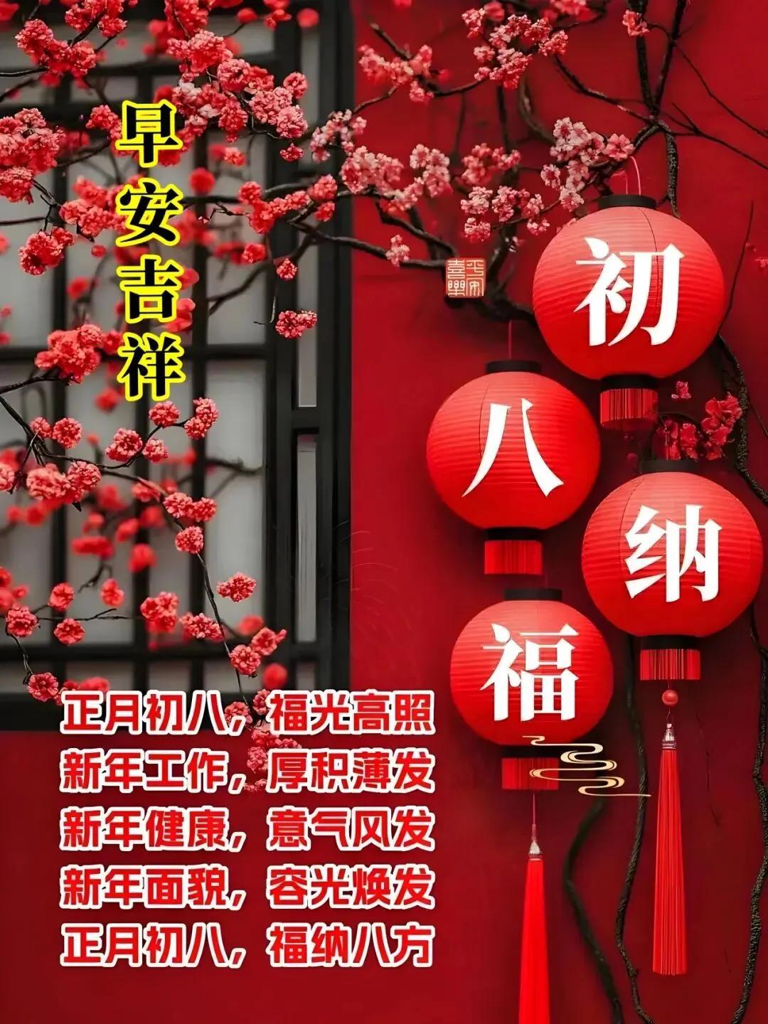 - 大年初八,早安吉祥!願你在這個美好的日子裏,感受到生活的美好與溫暖。願你的家庭充滿愛與關懷,朋友相伴,快樂常在,生活充滿甜蜜與幸福。