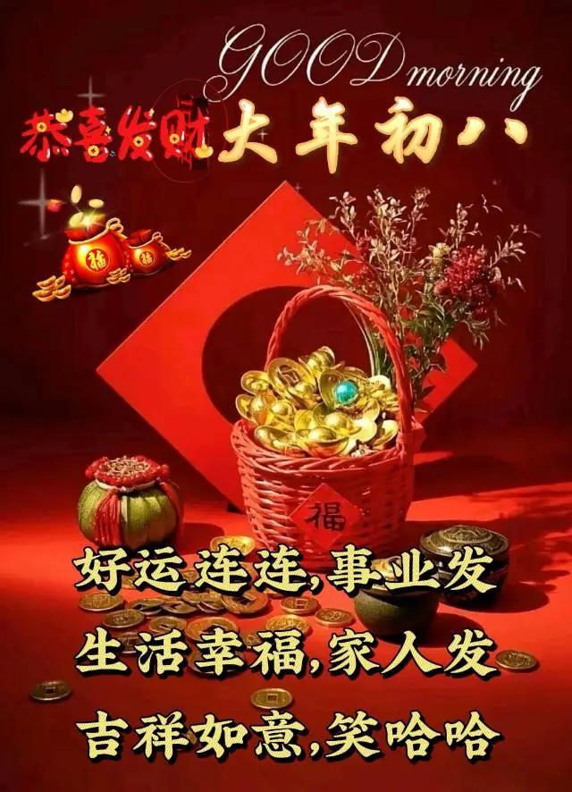 - 大年初八,早安!願你今日開門見喜,財源廣進,事業順遂,家庭和睦,萬事皆如意,蛇年行大運,福氣滿堂!
