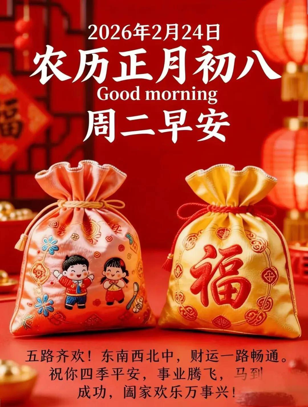 早安,大年初八。八方來財,八面玲瓏。窗外的第一縷陽光,是好運的開端。願你馬年財路通達八方,朋友遍佈四海。祝福送到:正財穩固,偏財驚喜,金銀入袋,富貴常伴。