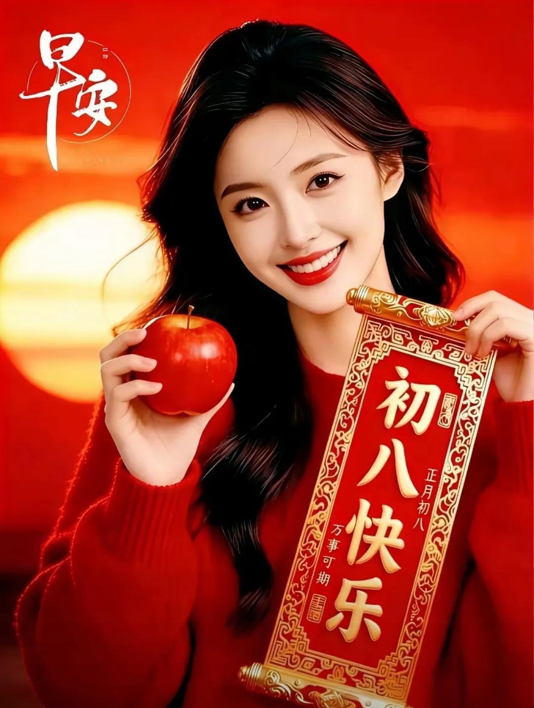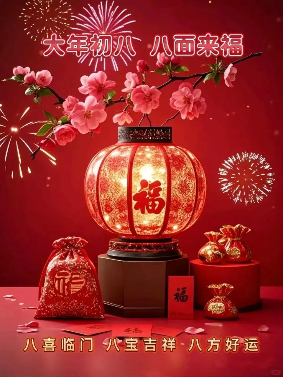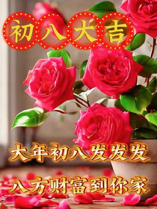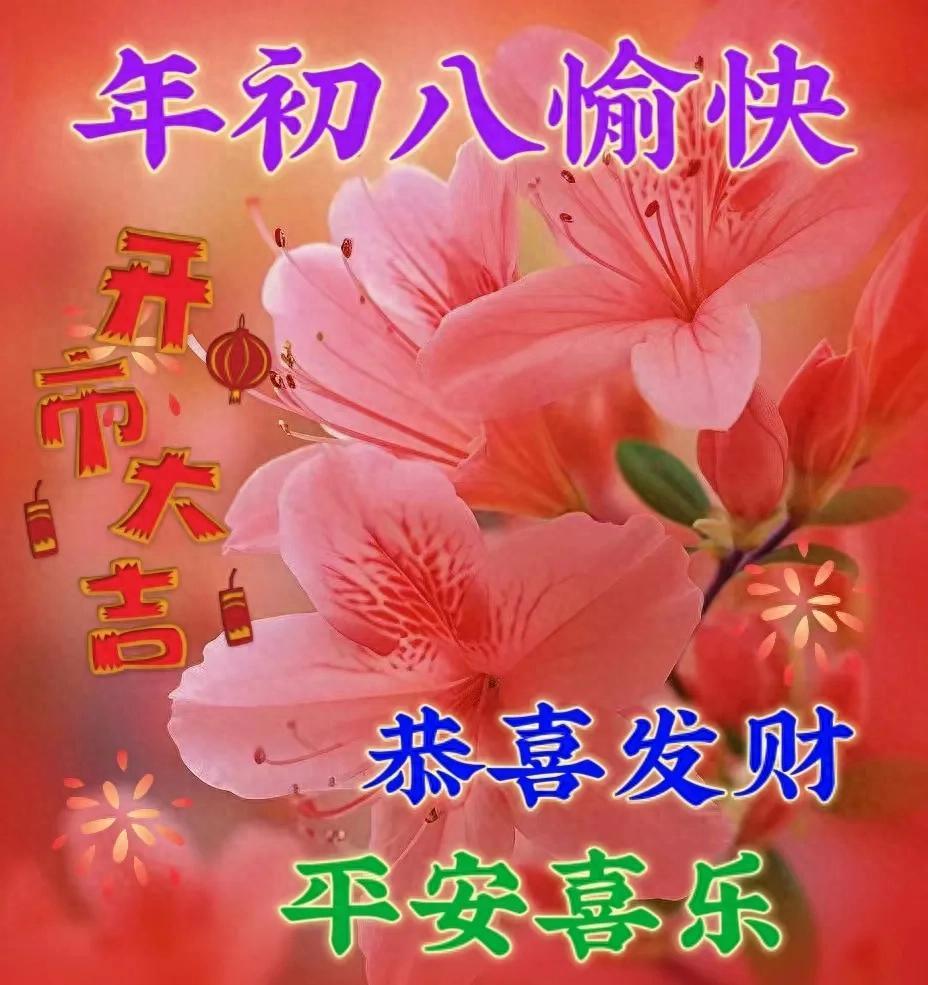 初八,贈君快樂花一朵,笑顏常展開;好運花相伴,福澤自然來。成功花盛開,前途光萬丈;平安花守護,千山越無礙。健康花永駐,體魄強且壯;幸福花滿枝,日子甜蜜蜜;願君持此花,歲歲皆如意,幸福永不離。