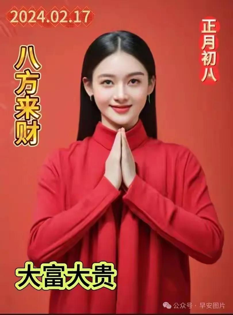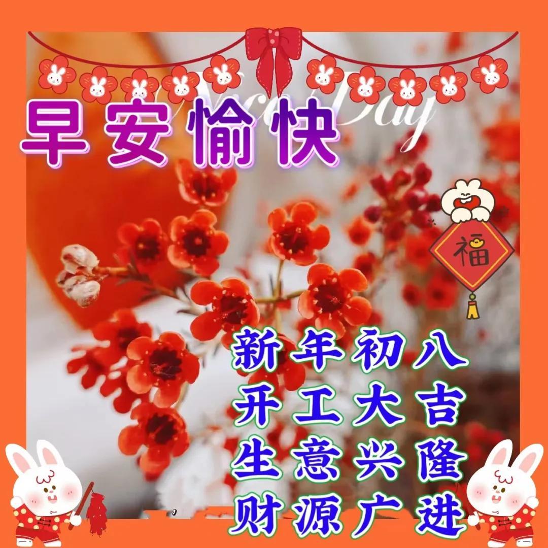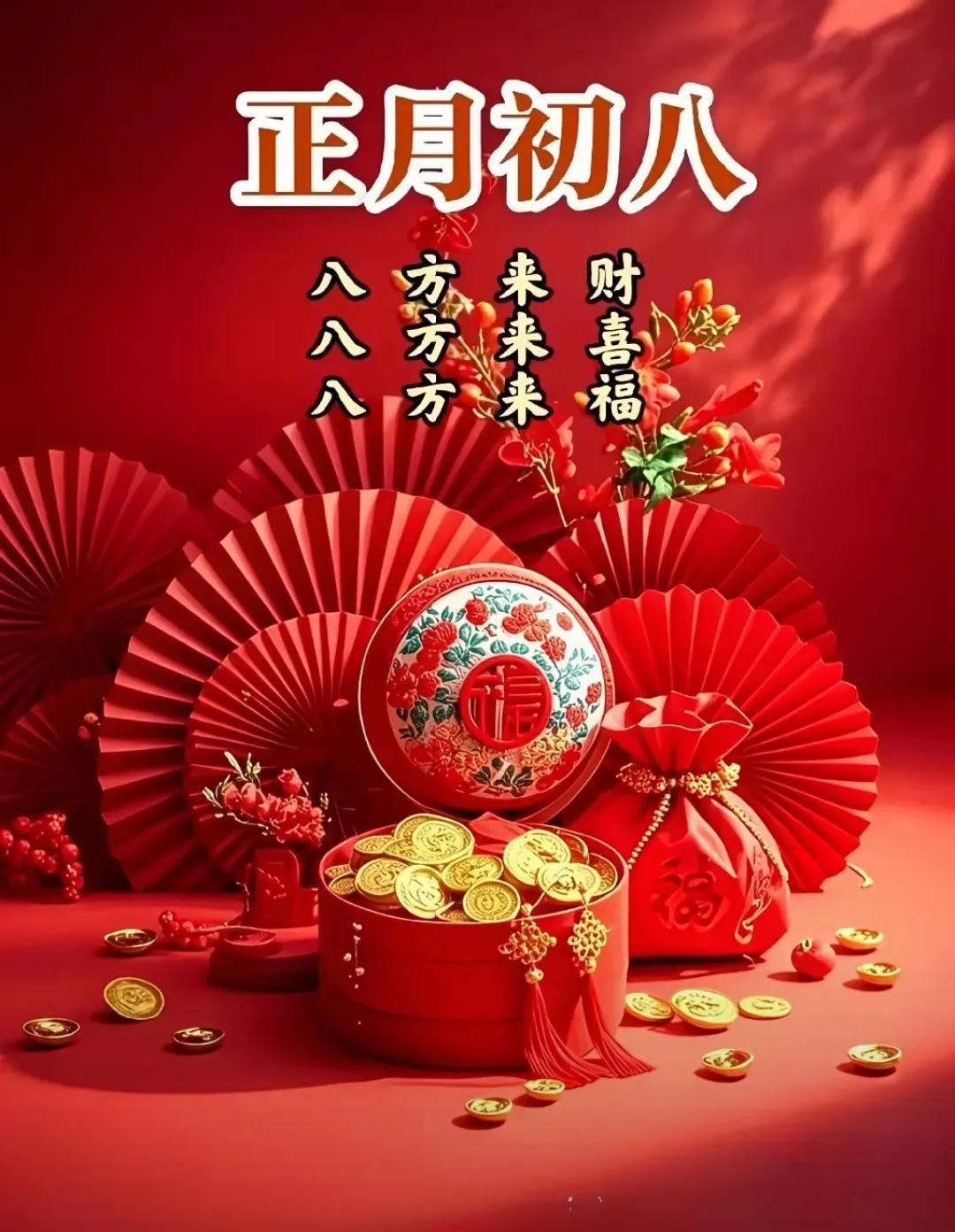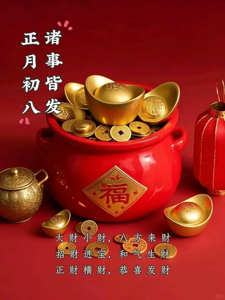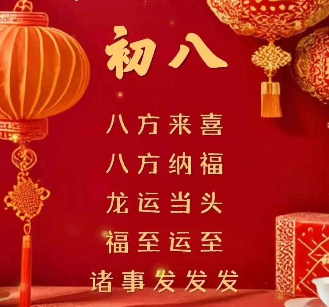 年初八,好運來,幸福家,財星照,財神抱,財門開,財運到,笑呵呵,樂逍遙,好日子,天天有,祝福你,財源滾,財氣旺,行大運,萬事昌,發一發,滿心喜,滿家發!