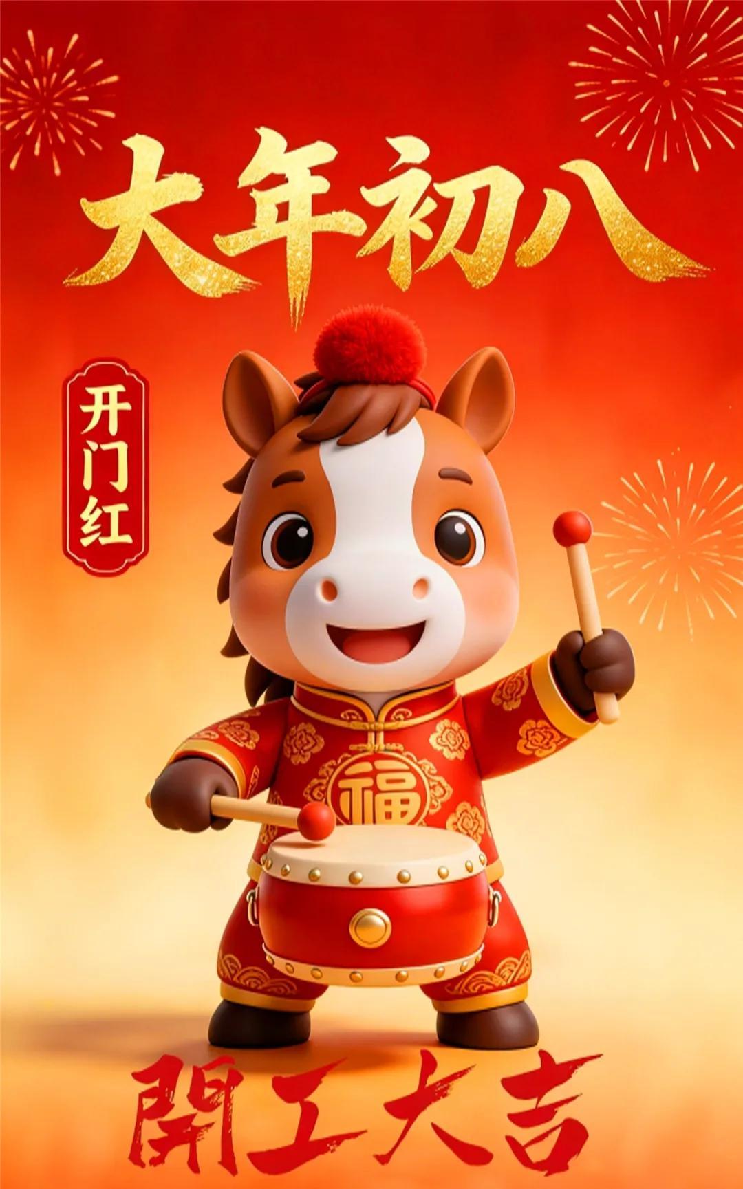 八方來財: 初八啓市,八方來財。打開大門迎百客,敲起鑼鼓納千祥。願丙午年,生意如駿馬奔騰,勢不可擋;財運如江河匯海,源源不斷,開市即紅火!