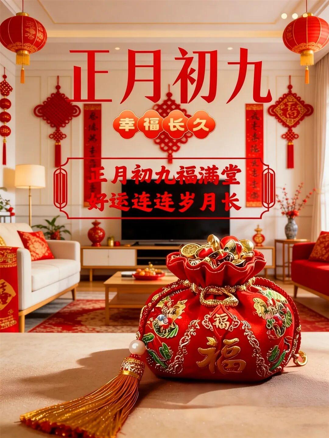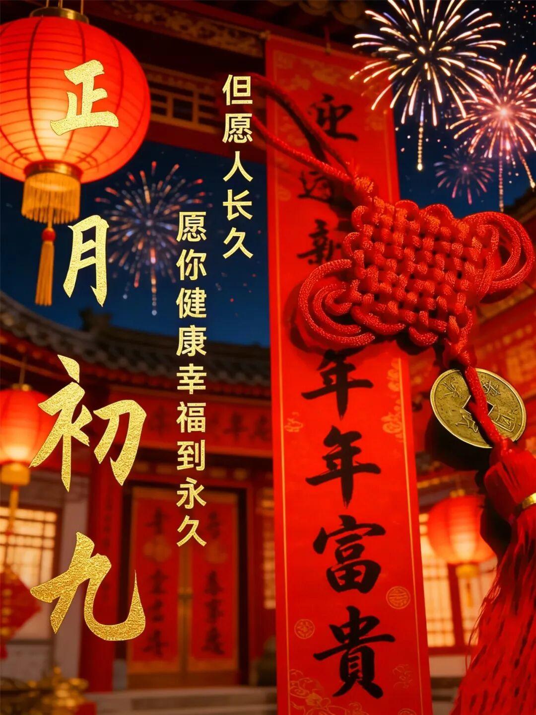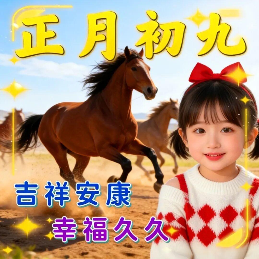 大年初九,送上我久久的祝福!願您擁有久久的情誼,久久的問候!在2026年裏,一路順遂,事事如意,收穫滿滿的幸福與成功!祝您馬年大吉,好運連連,健康平安每一天!