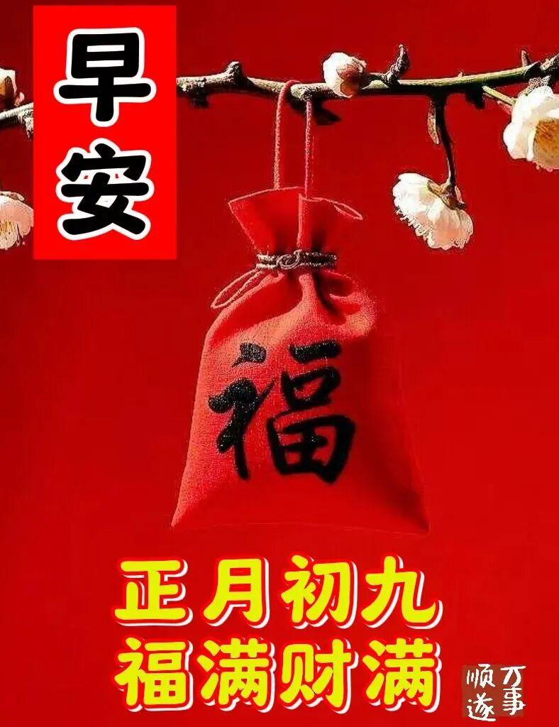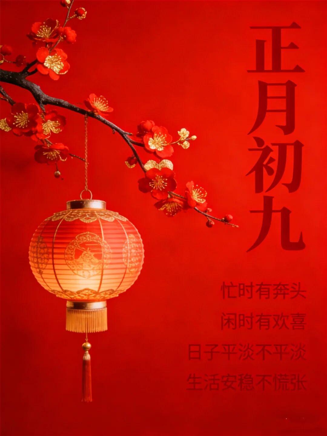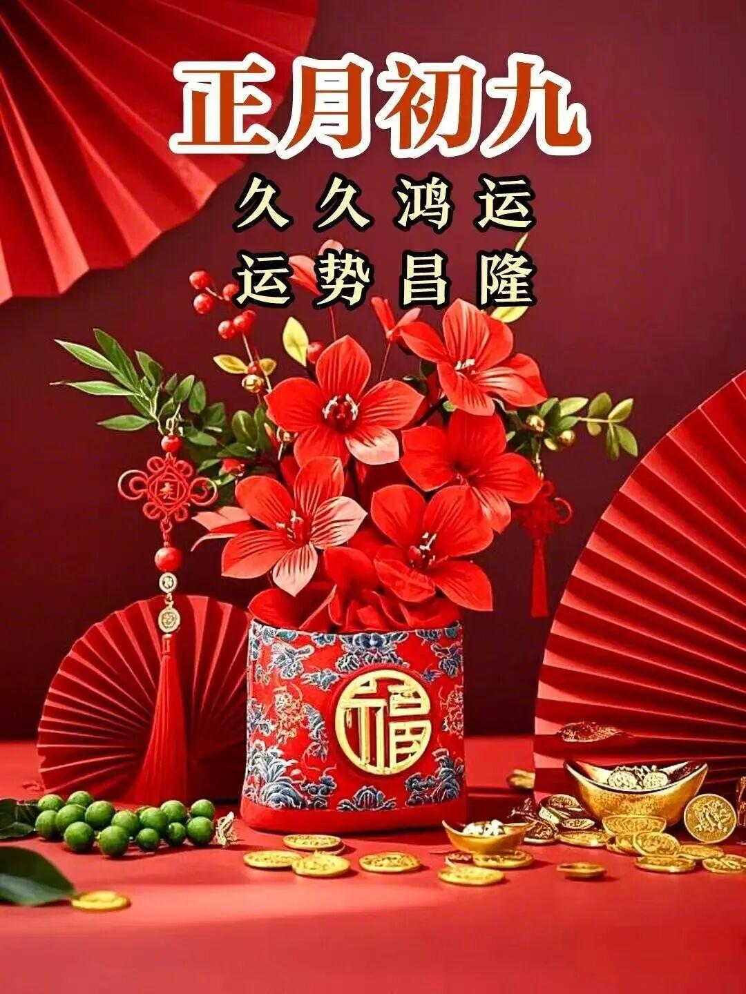 正月初九到,祝福來送到!新的一年,願你好運連連,萬事順心到永久!願你財運滾滾,大富大貴到永久!願你福運亨通,吉祥如意到永久!