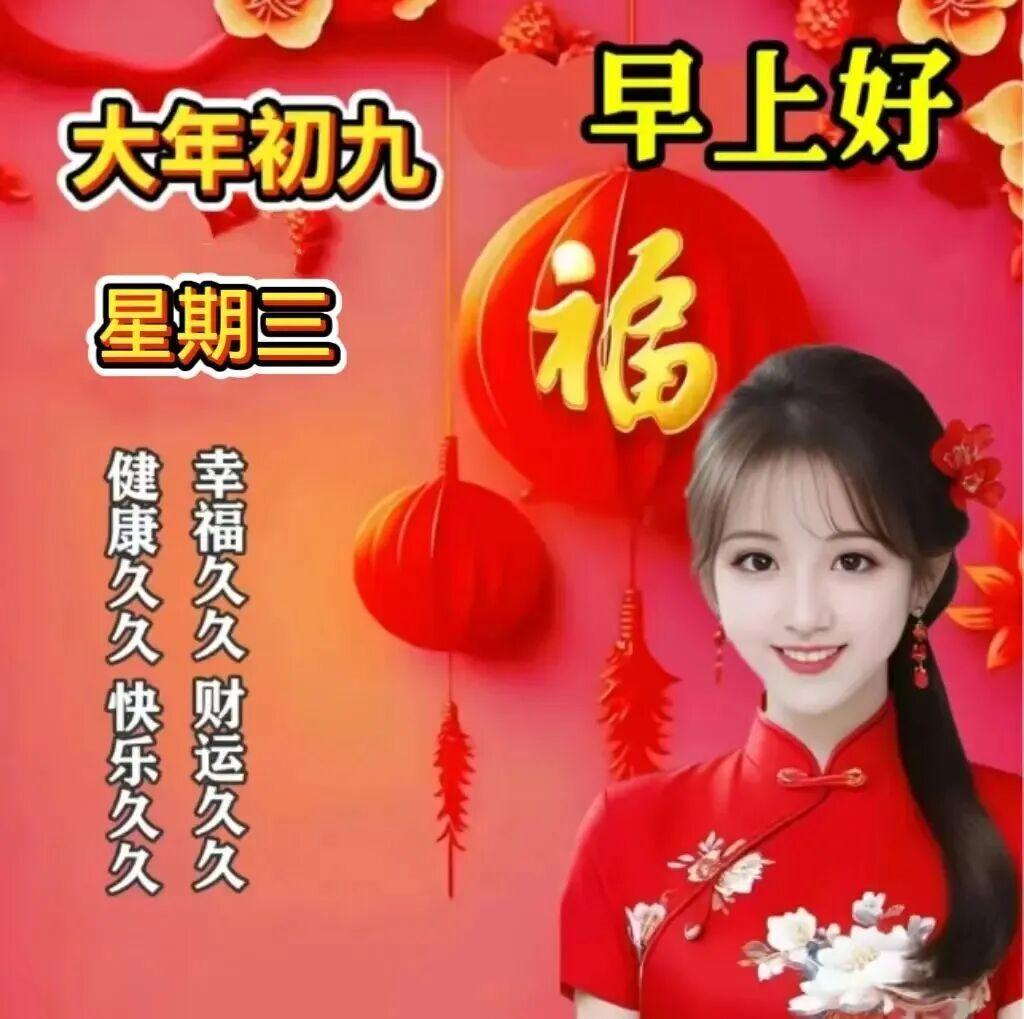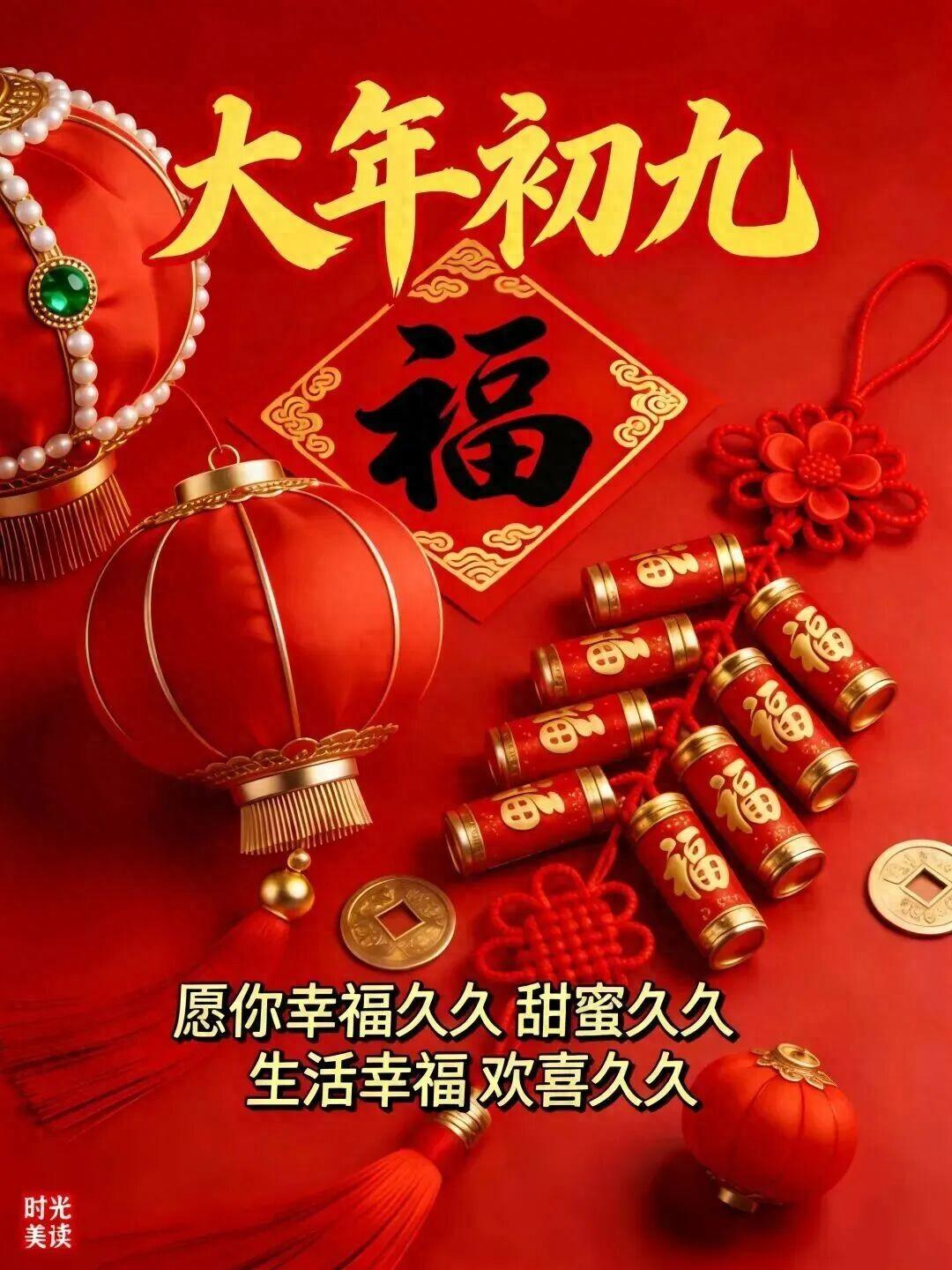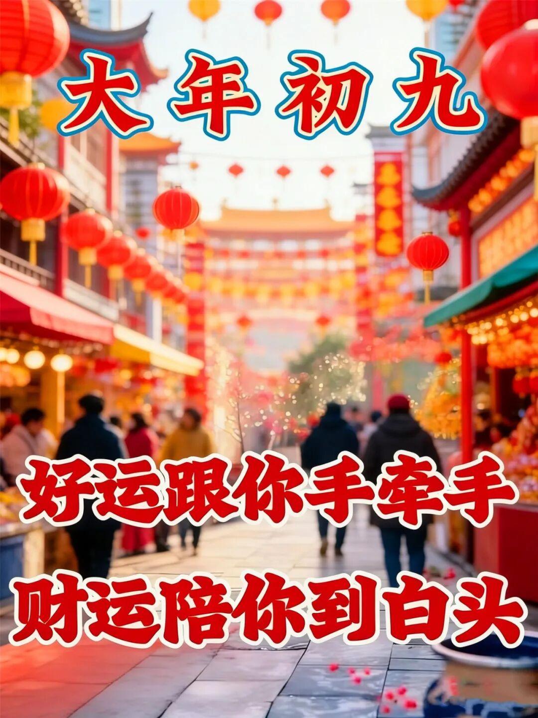 大年初九,祝福長久。一祝身體好,二祝心情妙,三祝快樂繞,四祝好運到,五祝財運來,六祝煩惱跑,七祝永不老,八祝家庭順,九祝萬事好!