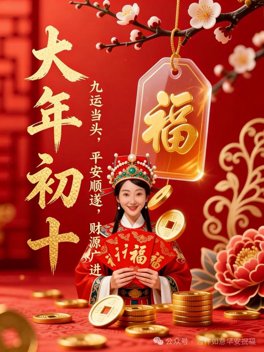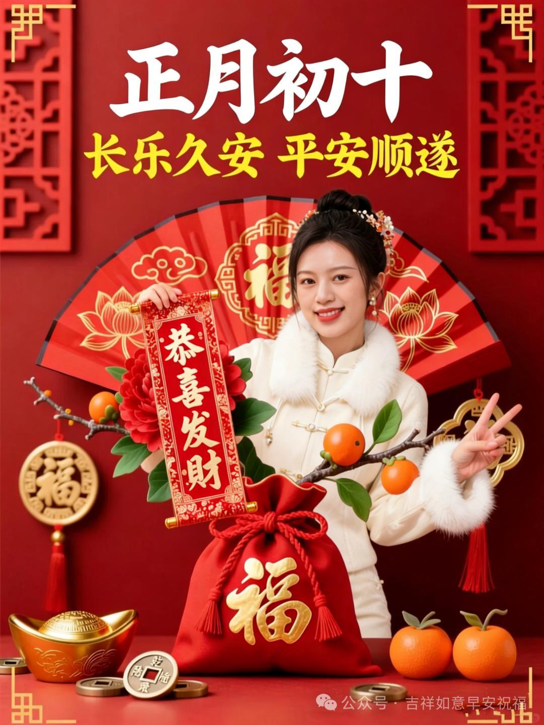 大年初十,我的祝福早送到:一祝身心康泰,二祝瑞氣盈門,三祝才思敏捷,四祝歲歲平安,五祝喜樂無憂,六祝萬事亨通,七祝家宅和睦,八祝財源滾滾,九祝鴻運長久,十祝十全十美。