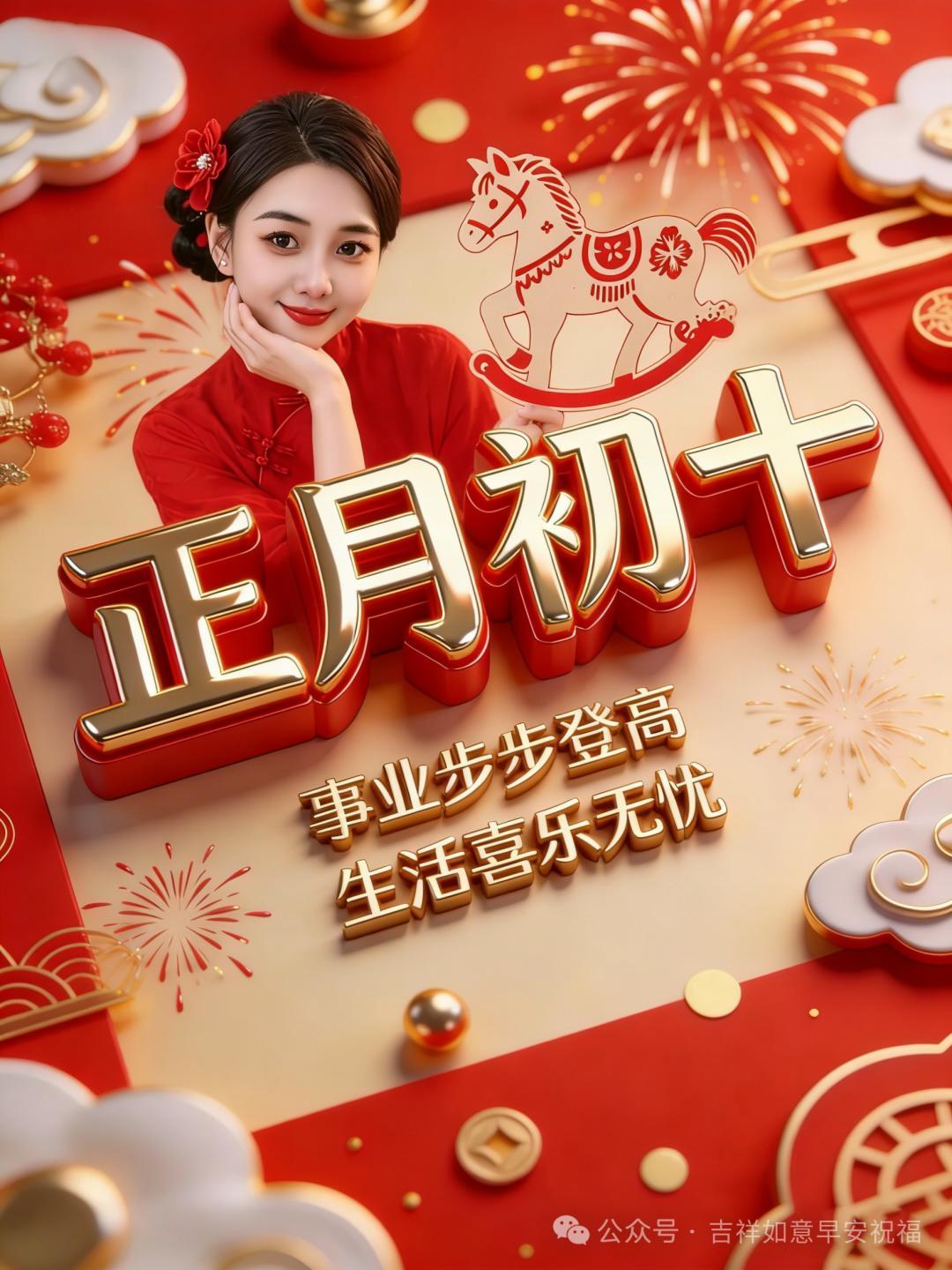 大年初十,圓滿如意,至誠祝福送給您,真心祝您,家庭十分和睦,日子十分舒心,心情十分爽朗,身體十分康健!策馬奔騰,萬事圓滿,事事順心!