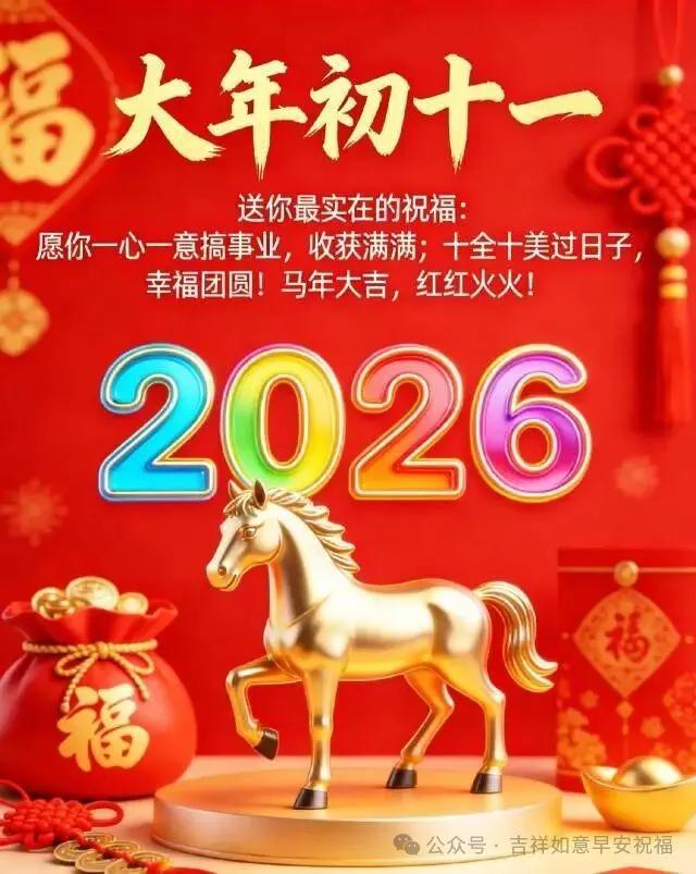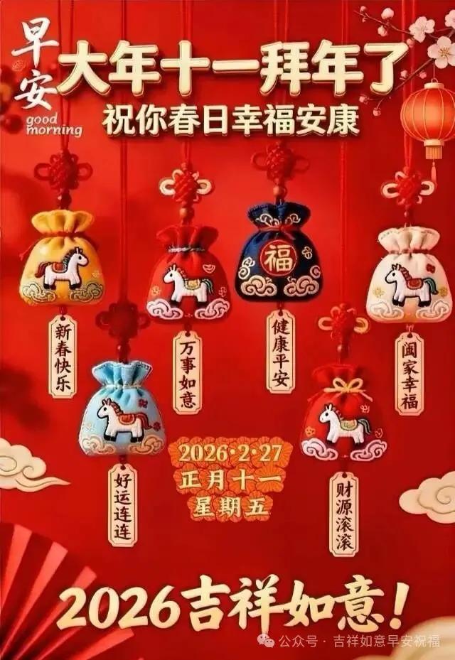 早安!在正月十一的明媚清晨,捎去滿滿的祈願給你,願你在新的一年裏財源滾滾,福祿綿綿至;願你擁有強健的身軀,福壽綿長久;願你事業翱翔,愈發顯輝煌;願你喜樂無憂,笑顏常綻歡。祝福馬年吉祥!