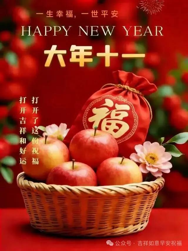 大年十一,新年最旺的如意之日,送你一往無前歲歲好,祝你心想事成節節高,願你在福星高照的日子裏,順順當當,樂樂陶陶