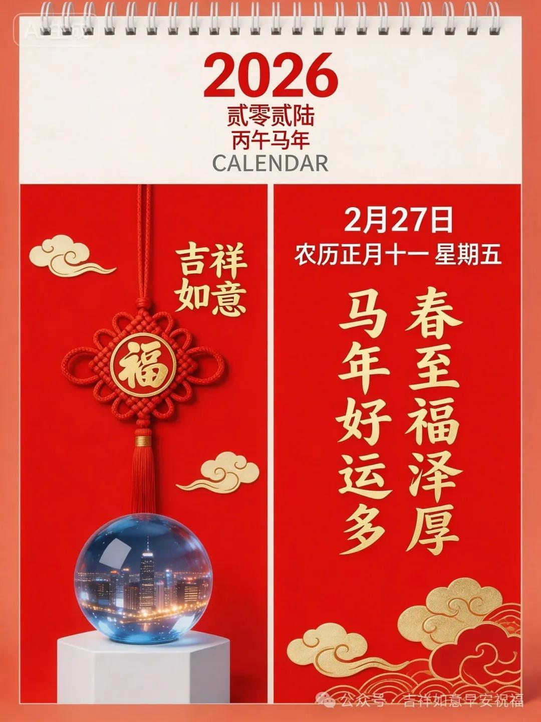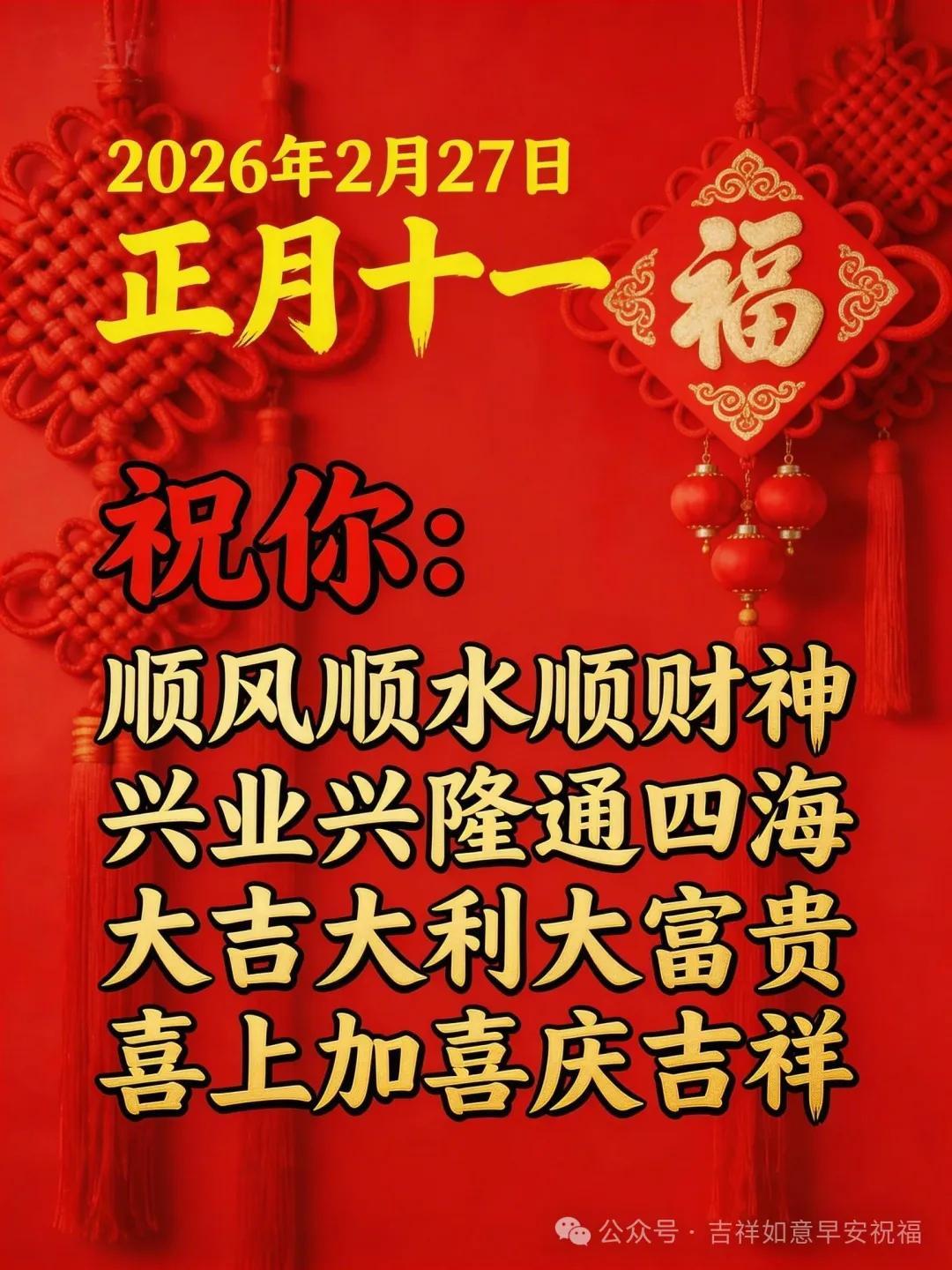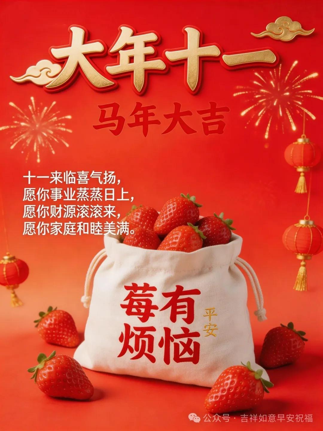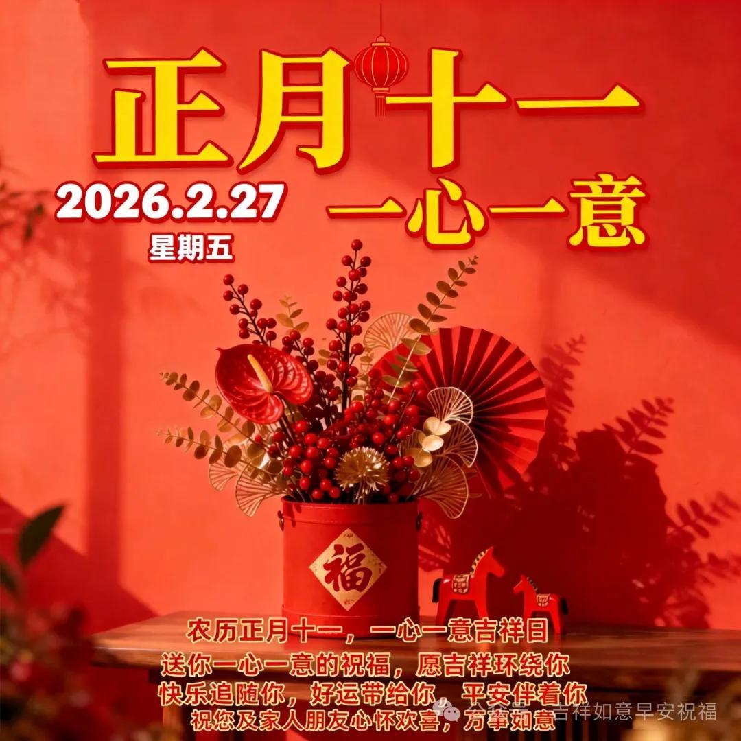 今天是大年十一,全心全意的問安,誠心誠意的祈福,祝您馬年騰飛!一年四季皆坦途,朝朝暮暮盡歡愉,願2026年萬事亨通!