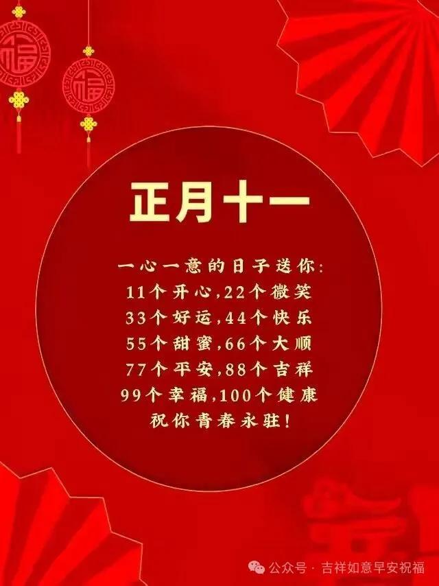 今天是正月十一春光漾,願你在這喜慶吉祥好時光✨,把福氣送予衆人享:年年如意福無量,歲歲平安體安康,財源廣進金滿箱,富貴吉祥家業旺,幸福安康福壽長,吉慶有餘喜洋洋,五福滿門瑞氣揚,喜氣洋洋福滿堂!早安吉祥!