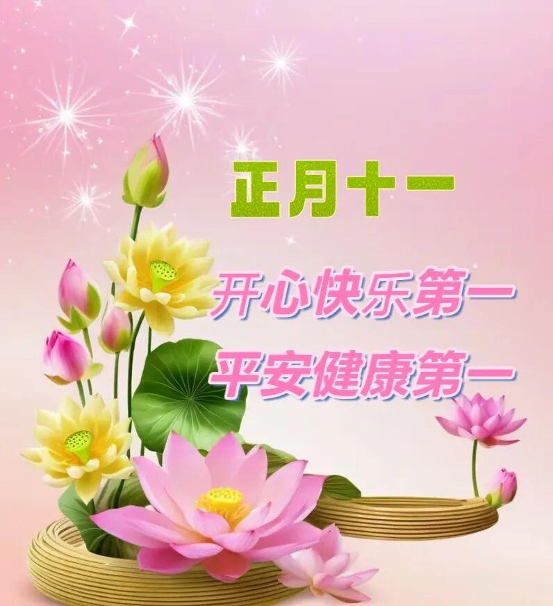 今天是正月十一,願你在這充滿喜慶,吉祥的日子裏,祝福所有人:年年如意、歲歲平安、財源廣進、富貴吉祥、幸福安康、吉慶有餘、五福滿門、喜氣洋洋!早安吉祥!