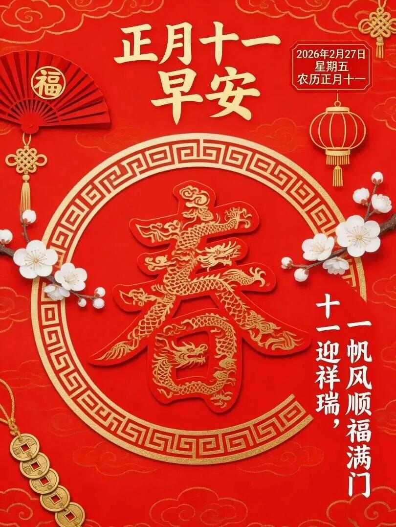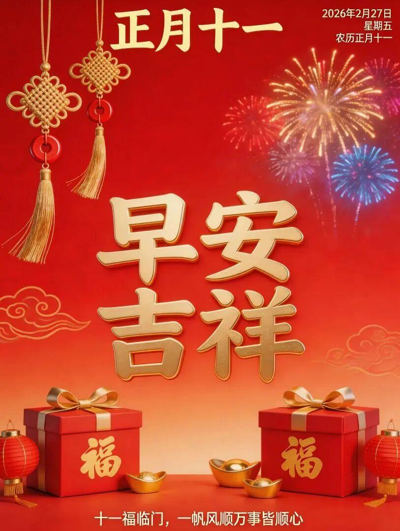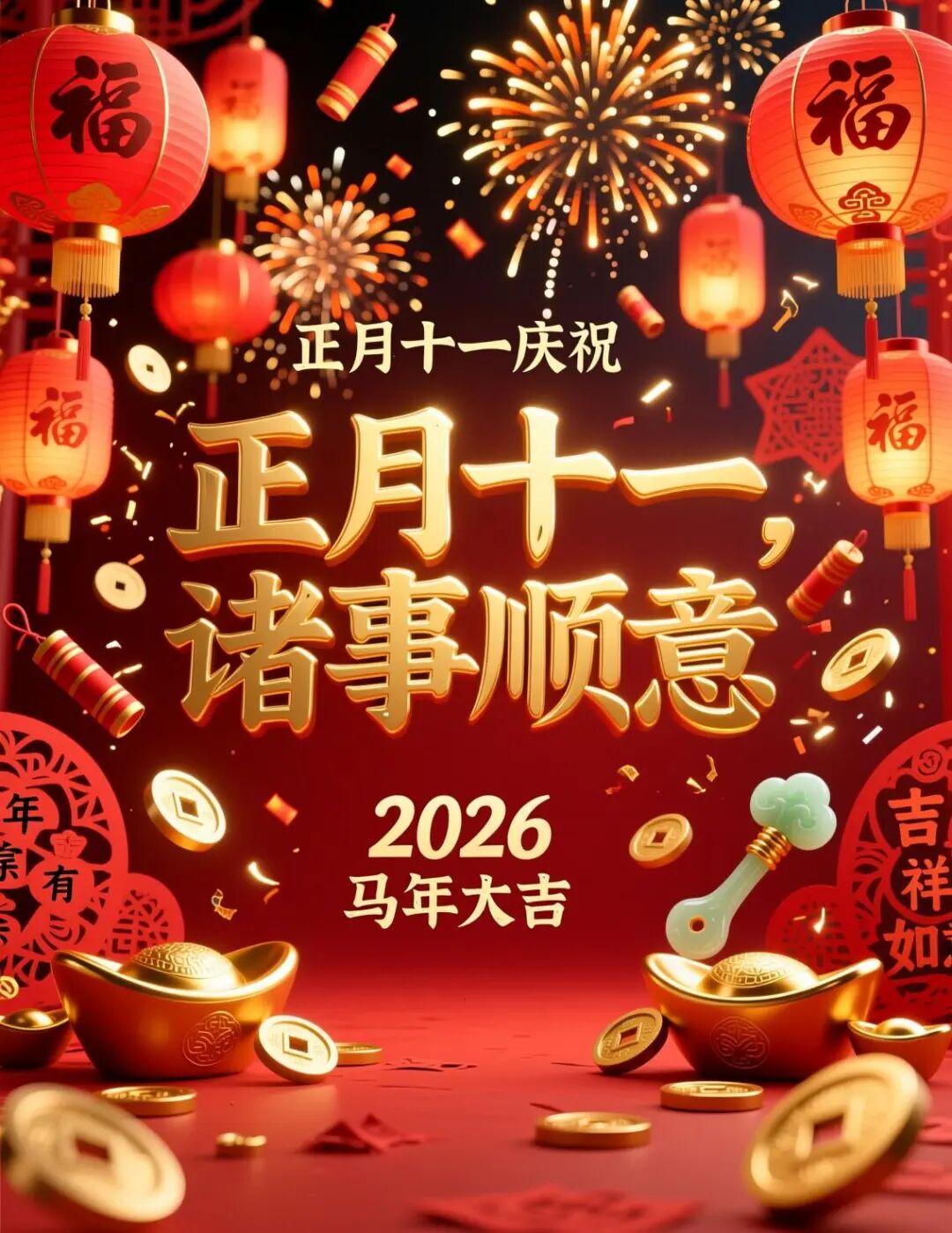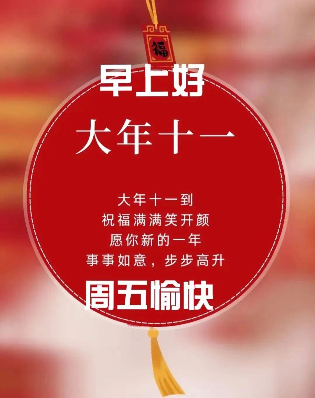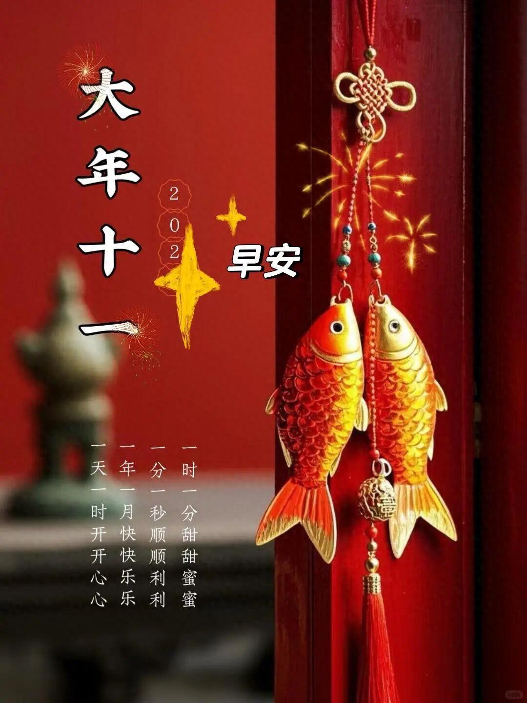 大年十一,送你一枚快樂,印在你心上;送你一束平安,插在你身上;送你一片好運,寄在你腰上;送你一打富貴,附在你頭上;送你一生幸福,把你捧得高高在上。祝你快樂每天,幸福永遠!❤️