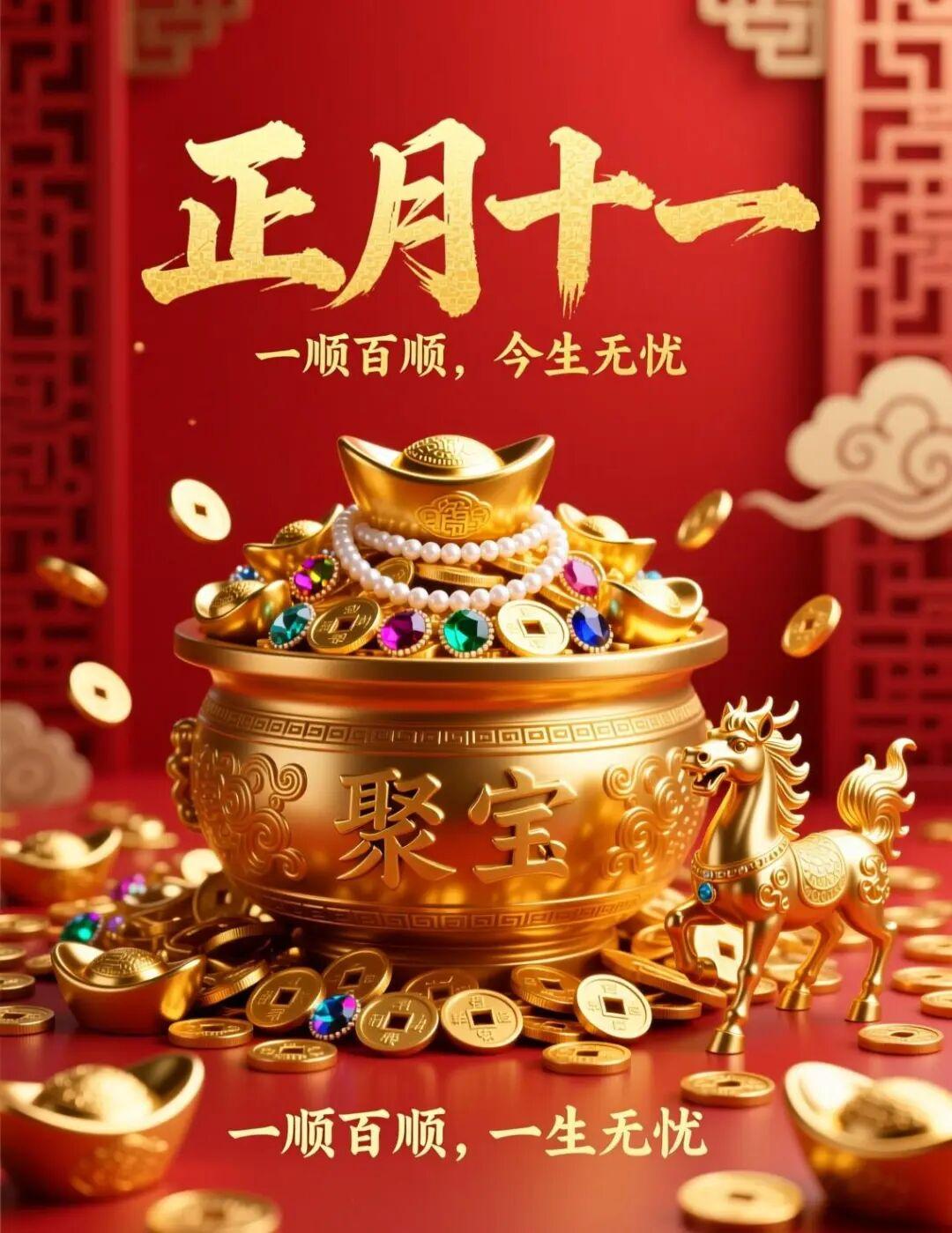 大年初十一,事事爭第一。納八方之瑞氣,聚四海之財源。願你把十一的福氣裝滿懷,將馬年的好運攬入懷。出門遇貴人,居家得清閒,福壽雙全,喜樂無邊。