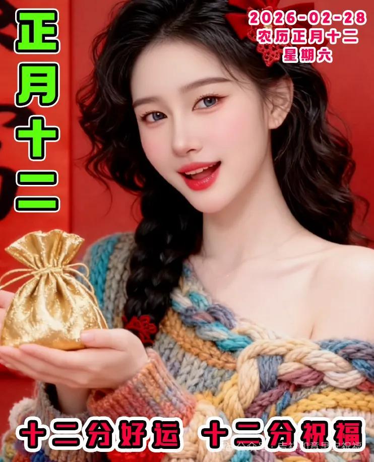正月十二福星來,帶來好運入你懷。財源滾滾如長江,喜慶紅包滿地灑。團圓餃子香味濃,幸福吉祥永相伴。身體健康心滿意,幸福快樂似馬奔。