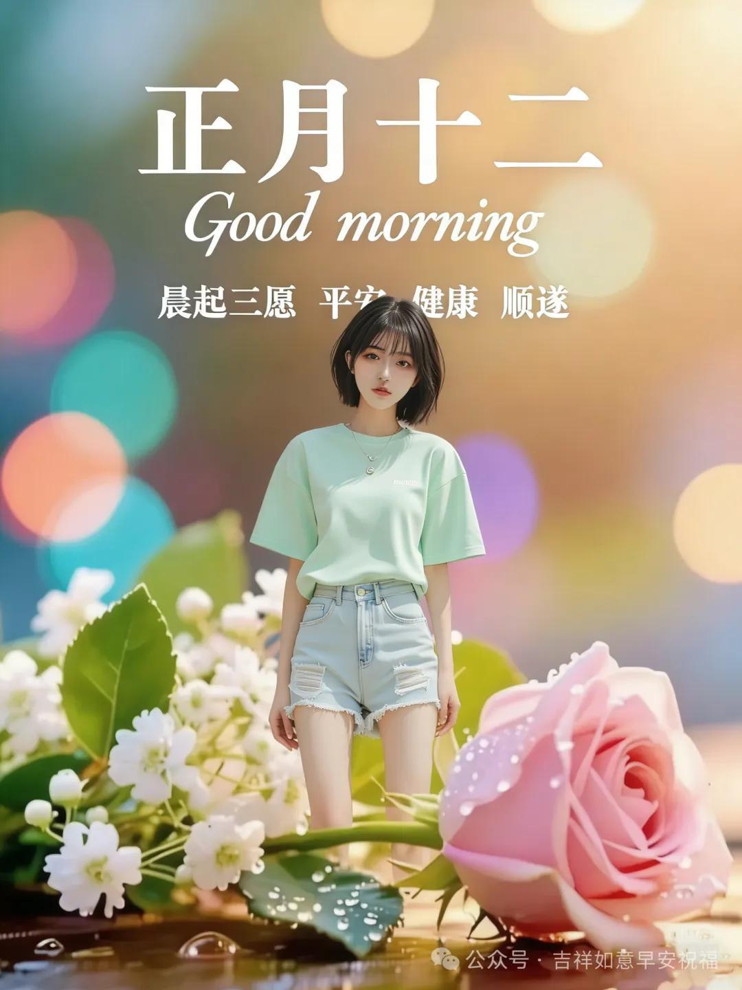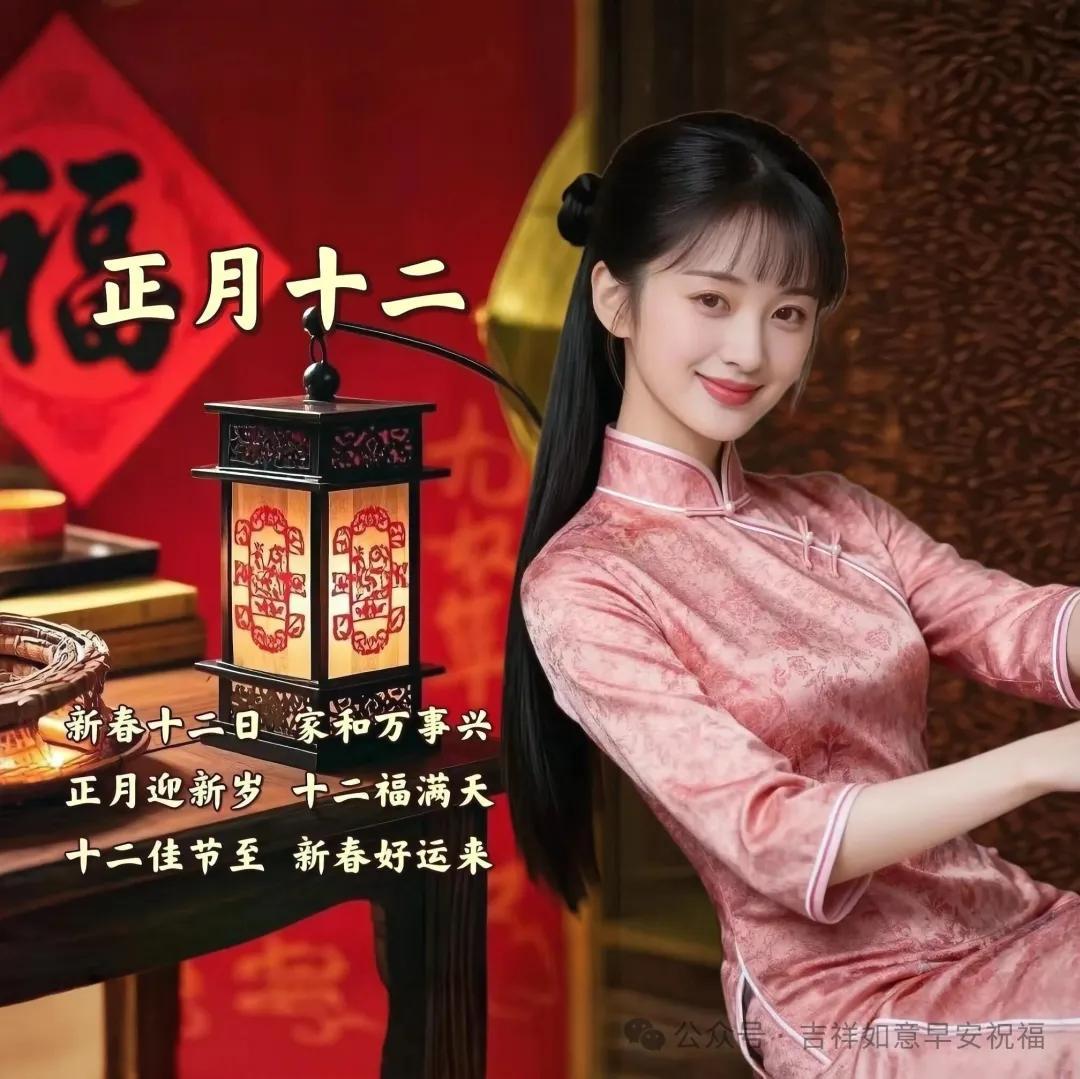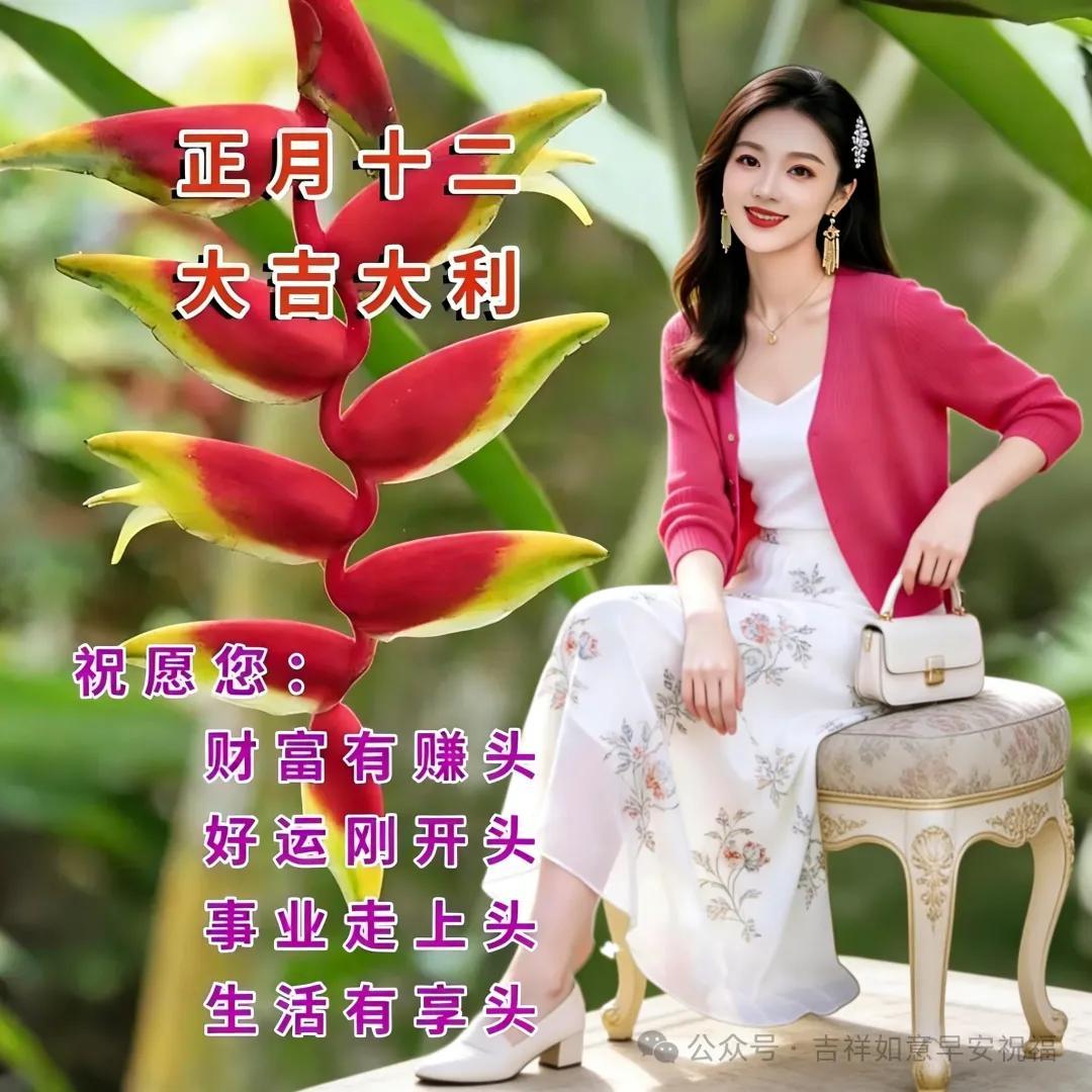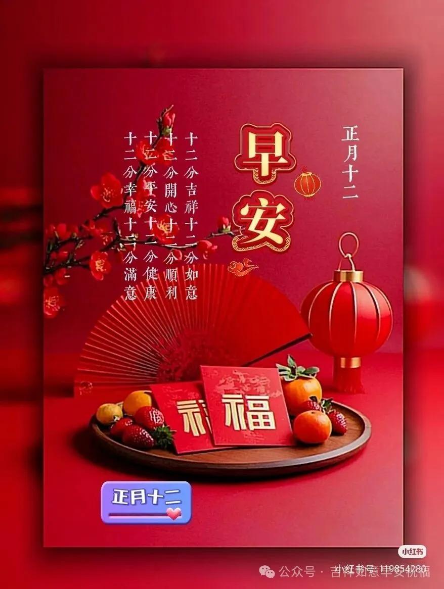 滿滿的祝福隨朝陽,甜甜的問候伴風揚。平安健康圍身旁,幸福快樂心中裝。正月十二晨光亮,吉祥如意永流長。願君每日都安康,生活處處有芬芳!