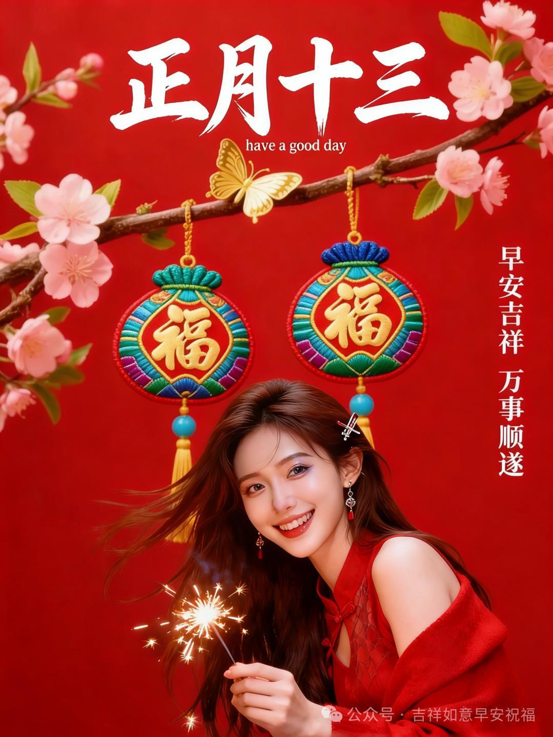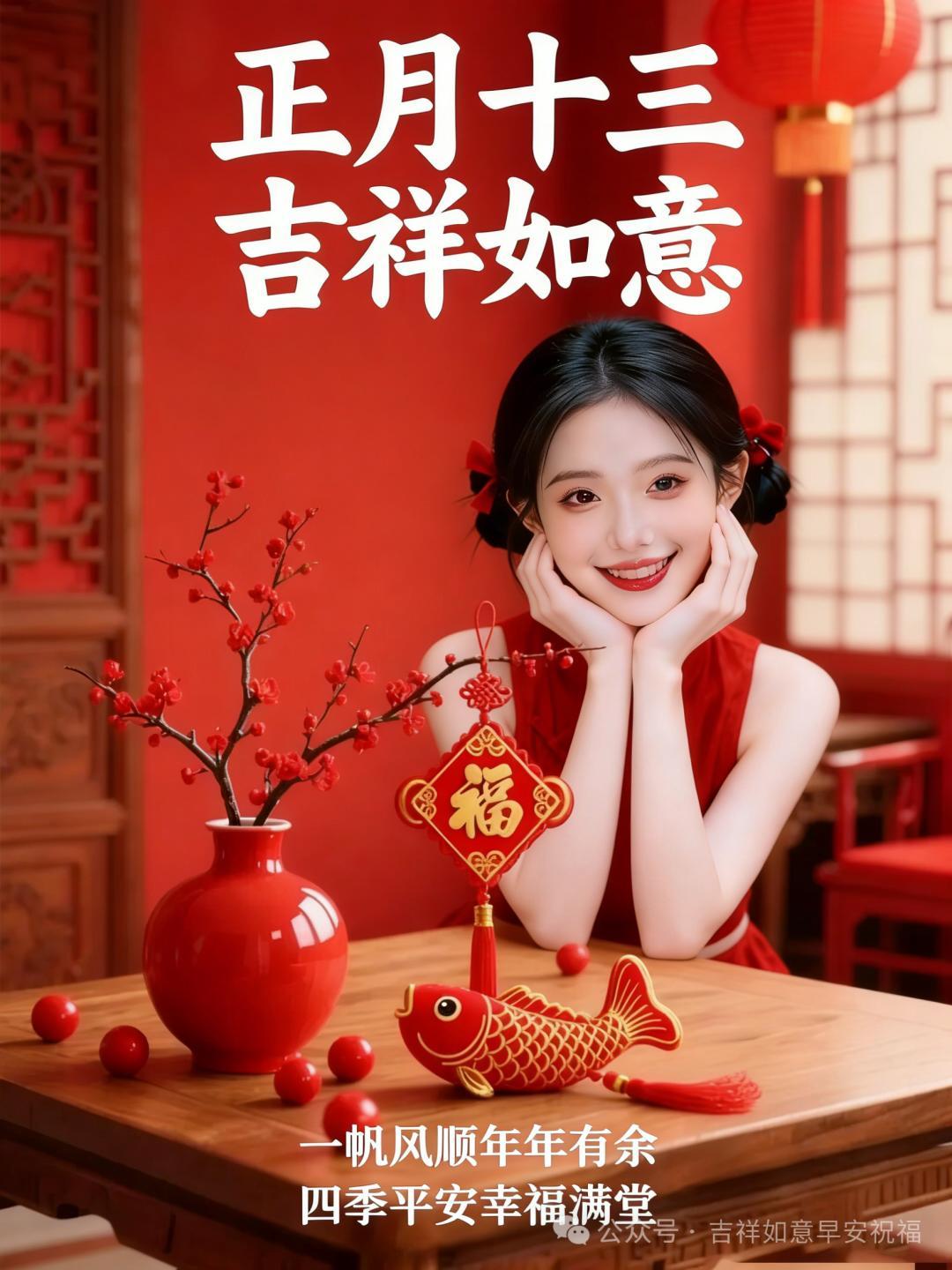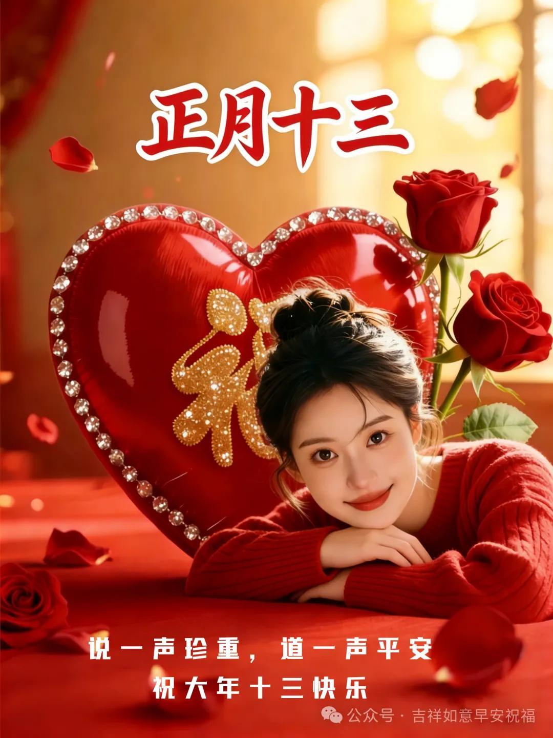 開富貴紅滿堂,福袋碩果滿滿裝;正月十三送祝福,拜年問候笑臉揚
