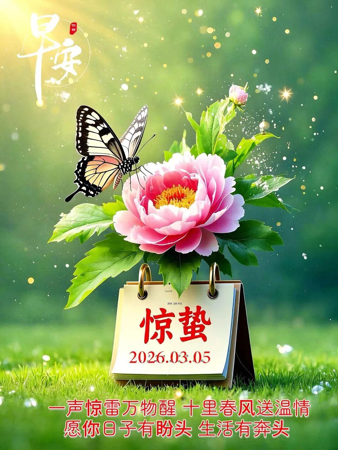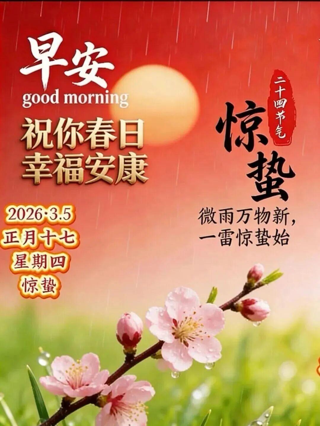 今天是2026年3月5日,驚蟄節氣。驚蟄,是春天的第三個節氣,春雷響,萬物長,美好都和春天一同醒來,最是一年好春光。願你在這個春天,身體健康,精神飽滿,暢享春光,喜樂常伴,早安~