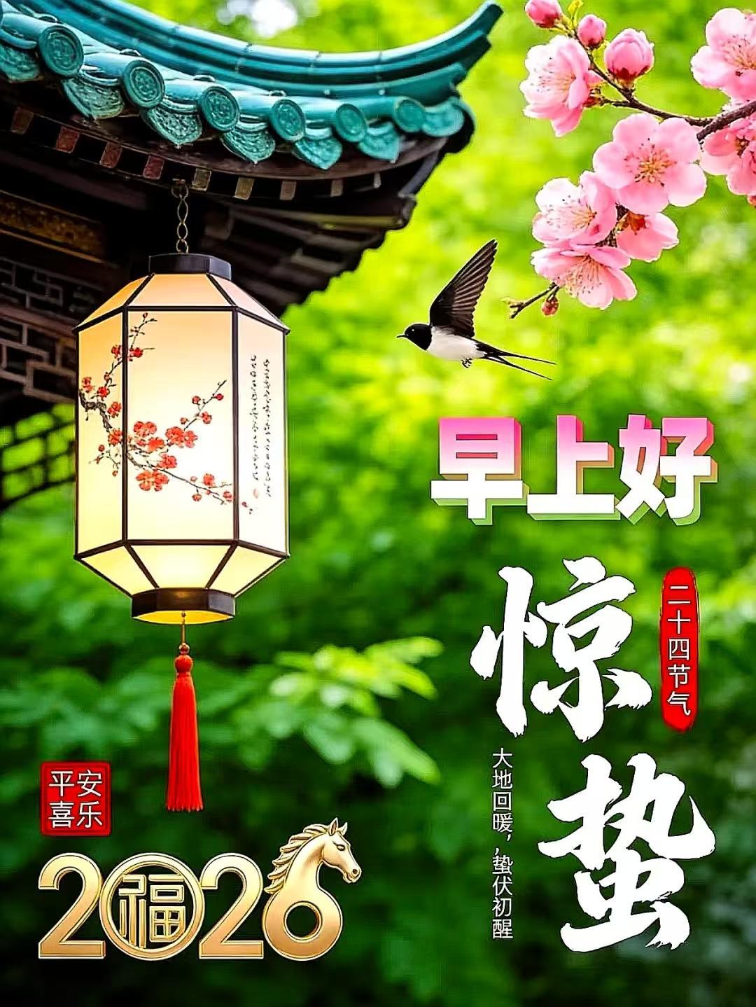 春雷震戶納祥光,福字高懸映滿堂;竈火煨湯暖舊歲,新燕築巢安心房;驚蟄啓幕萬象盛,歲歲今朝勝昔芳。早上好!❤️☀️