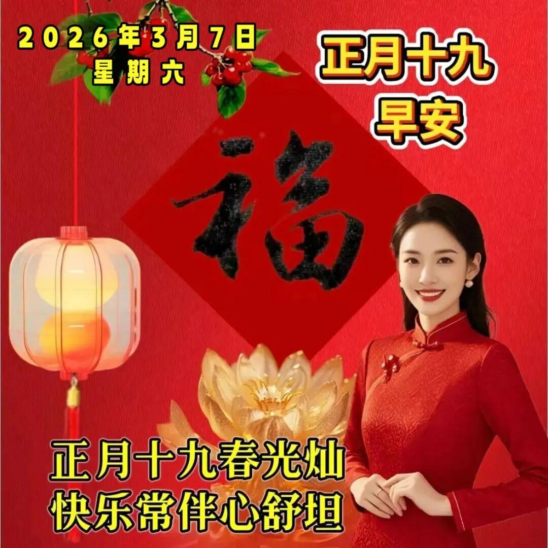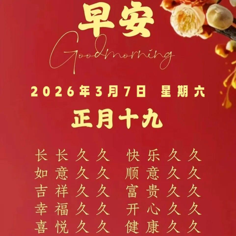 早安!今天是 2026 年 3 月 7 日,農曆正月十九。新的一天,新的開始,願陽光溫暖心房,清風帶走煩惱,好運伴隨身旁。願您喫得香、睡得穩、身體棒、心情爽,平平安安每一天,健健康康永不老,事事順心,天天如意,幸福常伴!