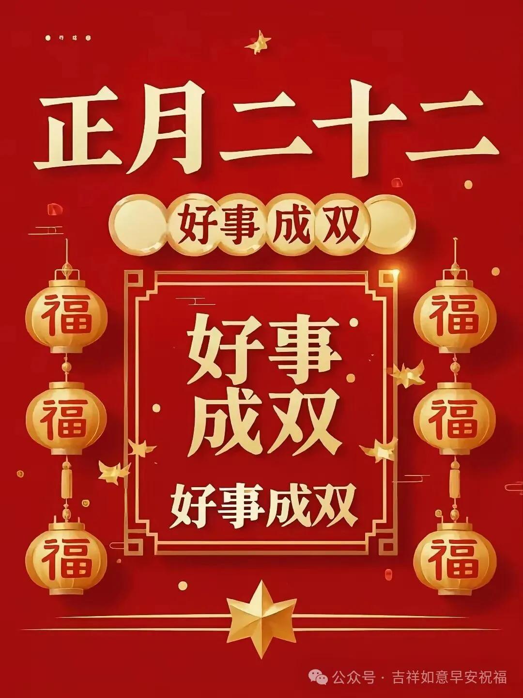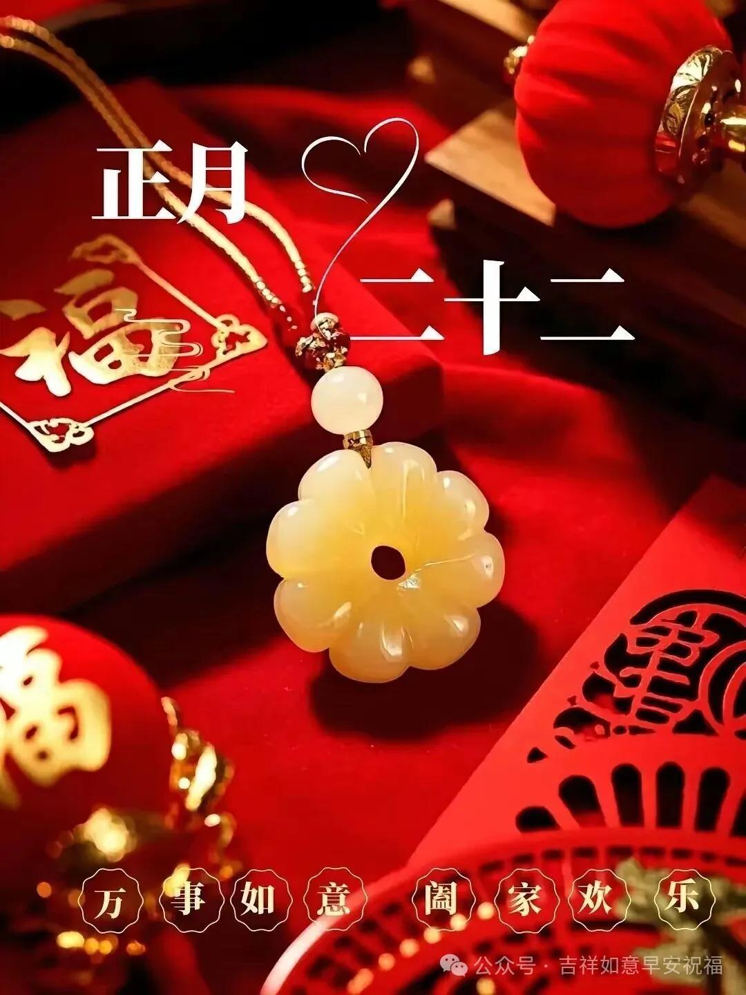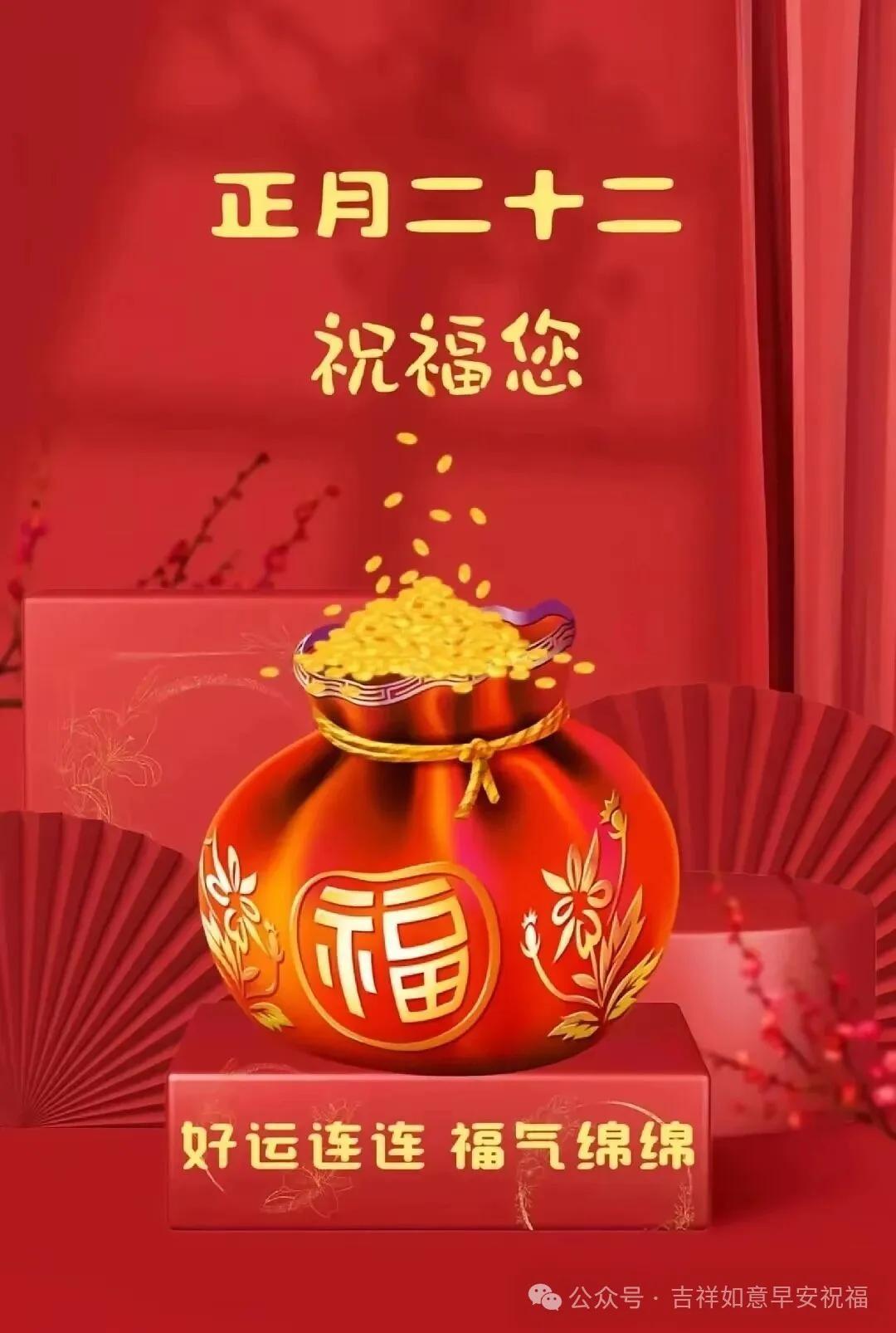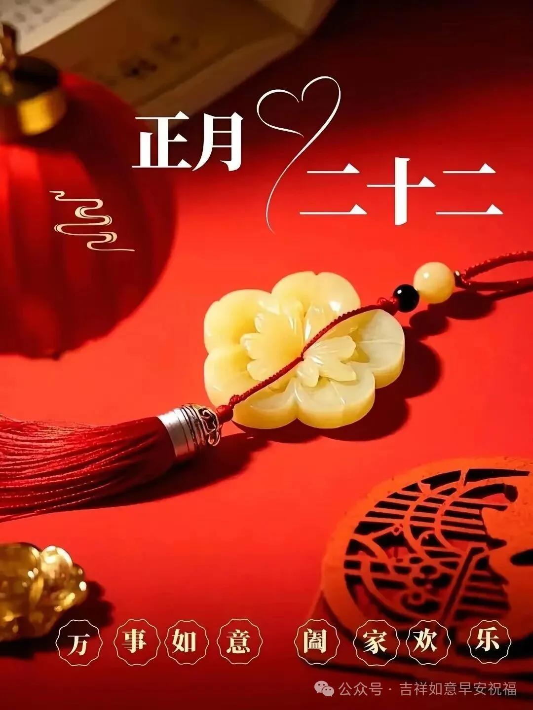 輕輕地問候帶來福氣,濃濃的情誼送來美滿!正月廿二,祝您馬年走好運,事業家庭雙豐收,愛情美滿甜如蜜,家庭和睦幸福來,願您事事都順心!