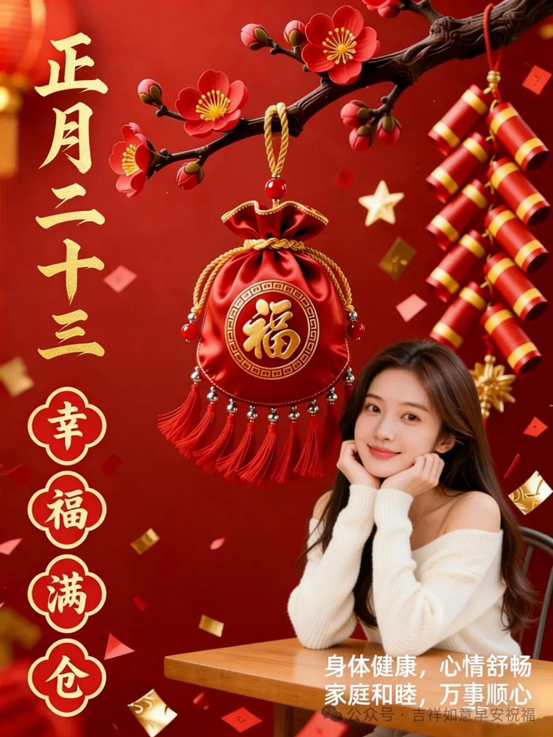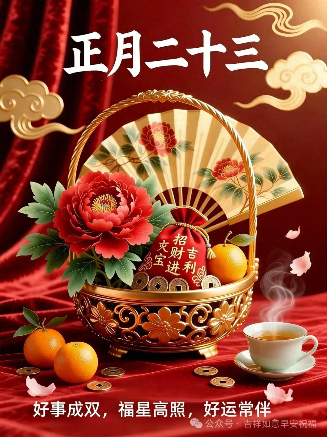 今天是正月廿三,人間真情勝春光,留得溫馨心中裝;不求今生多富貴,但願相互都安康;願我們天天心情愉悅,讓幸福永遠對你微笑!朋友早上好!