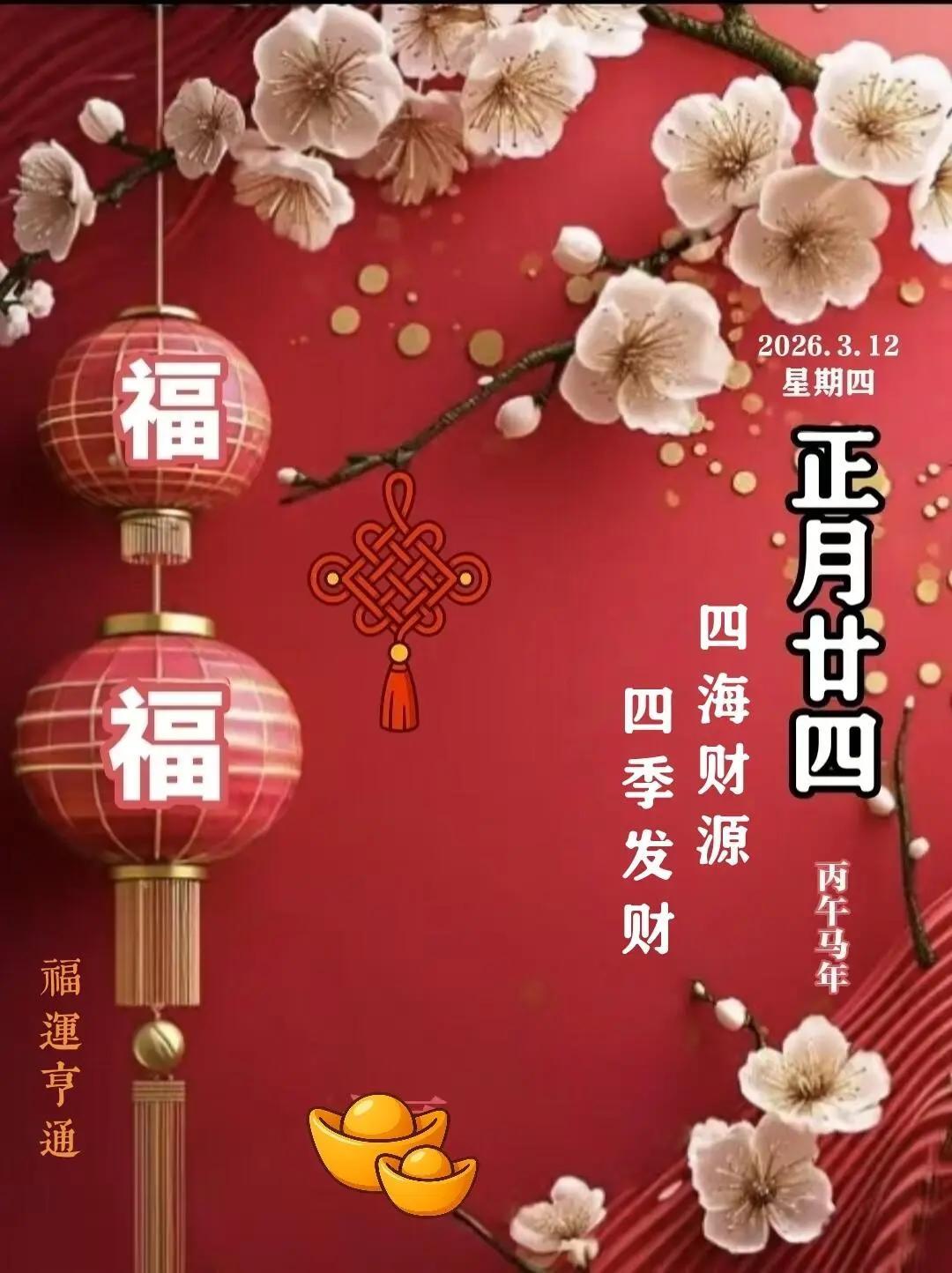 正月廿四,福氣盈門。借這美好的日子,祝你我福壽齊天,富貴安康;人財兩旺,歲歲平安。人順家順,萬事皆順。鴻福臨門,喜運相伴。願生活蒸蒸日上,前程步步高昇,事事如願,步步生輝。