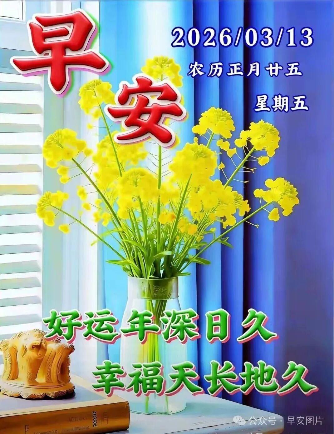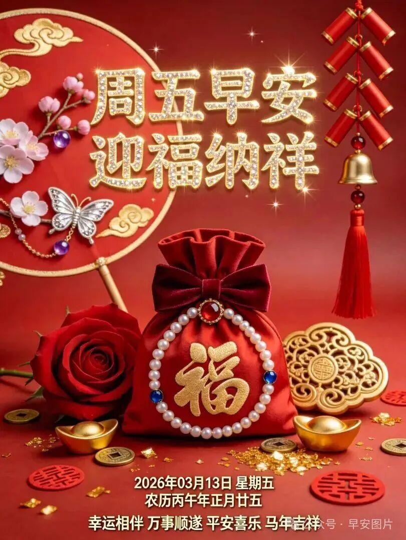 今天是2026年3月13日,正月二十五,週五,填倉節,祝福滿倉,祝您生活安康,好運滿倉,祝您吉星高照,快樂滿倉,祝您天天露笑顏,平安滿倉,祝您身體健康,財運滿倉,祝您財源滾滾來!早安!