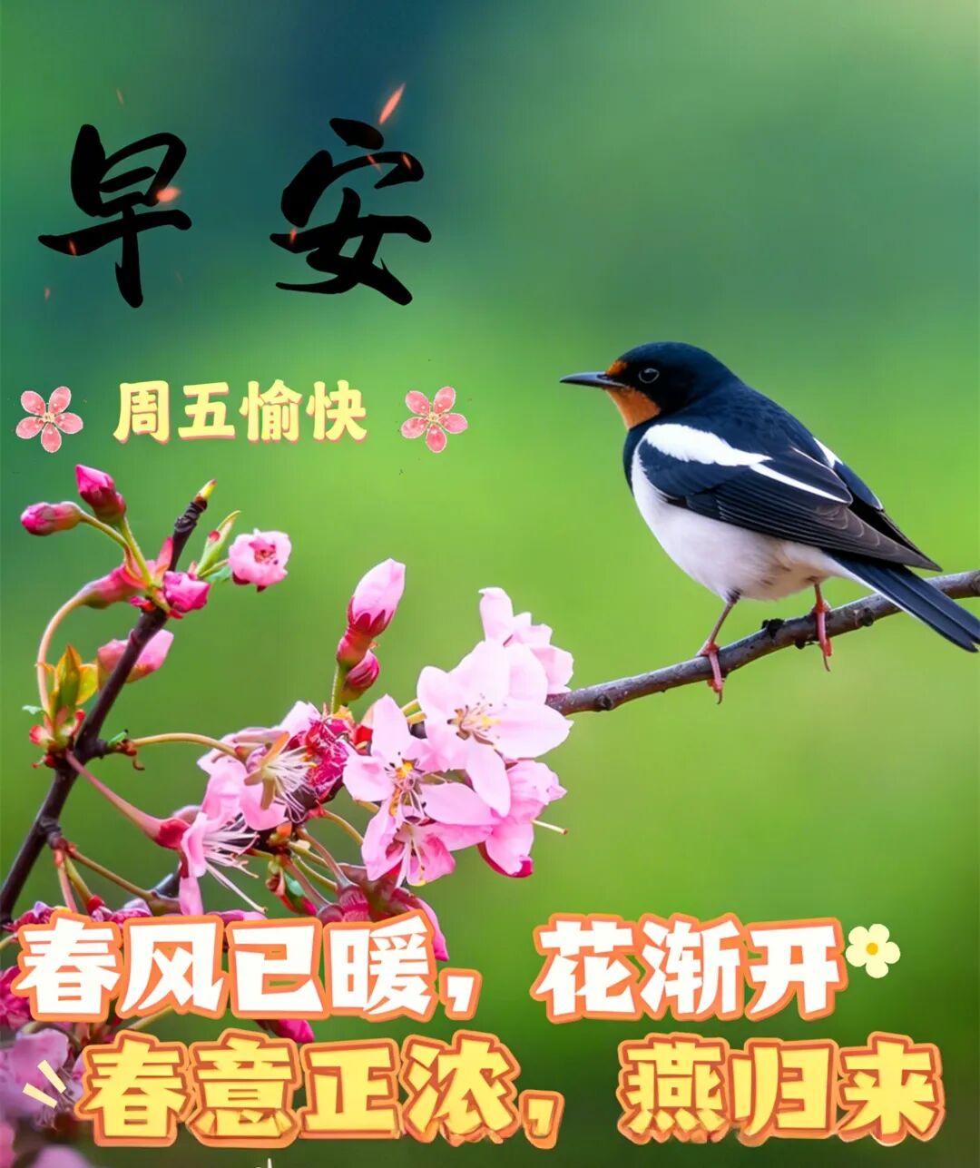 週五早上好,把美好的祝福,寫在春天的清晨,將溫馨的問候,送給最好的朋友:時時開心快樂,天天順心舒暢,季季平安健康,年年如意吉祥!