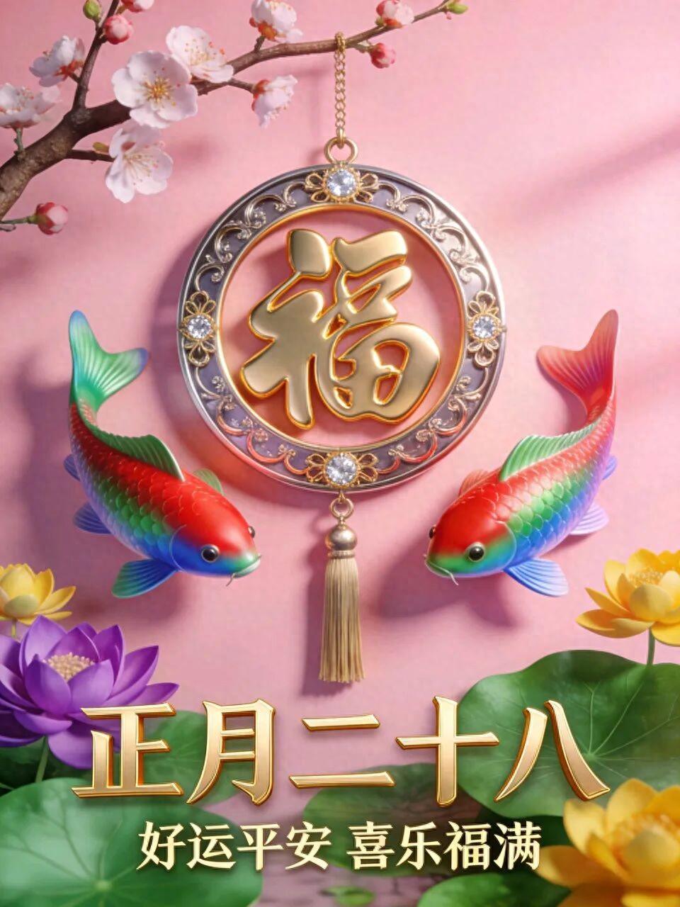 正月二十八早上好!願你身強步履健,意氣風發迎晨光;清晨祝福送安康,美好日子又開場;祝君生生世世順,世世生生福壽全。