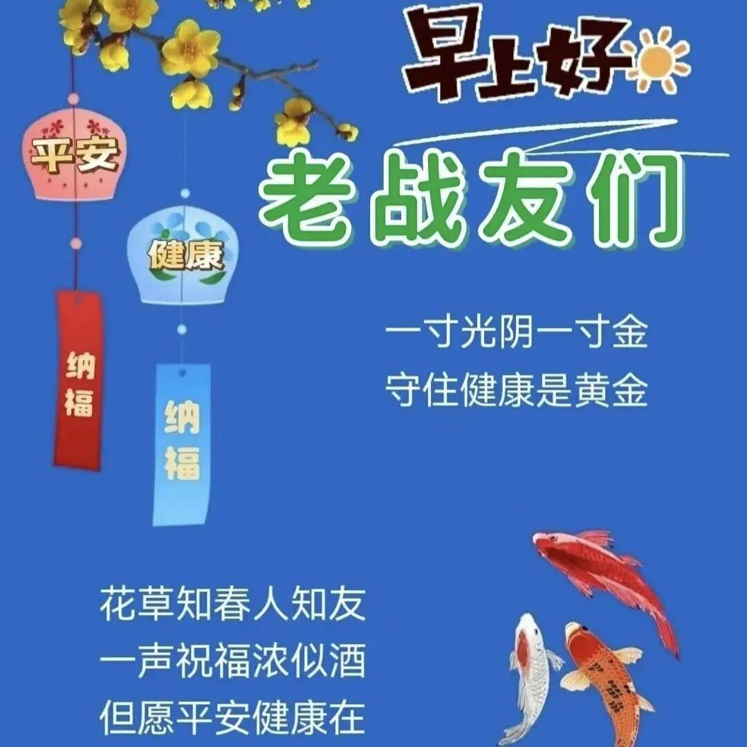 春和百花香,夏和荷風涼,秋和碩果豐,冬和瑞雪祥。一歲一枯榮,一步一成長。願往後的時光,我們家家都和樂美滿,人人都康健順意!多彩人生有你伴我就是幸運!戰友,早上好!
