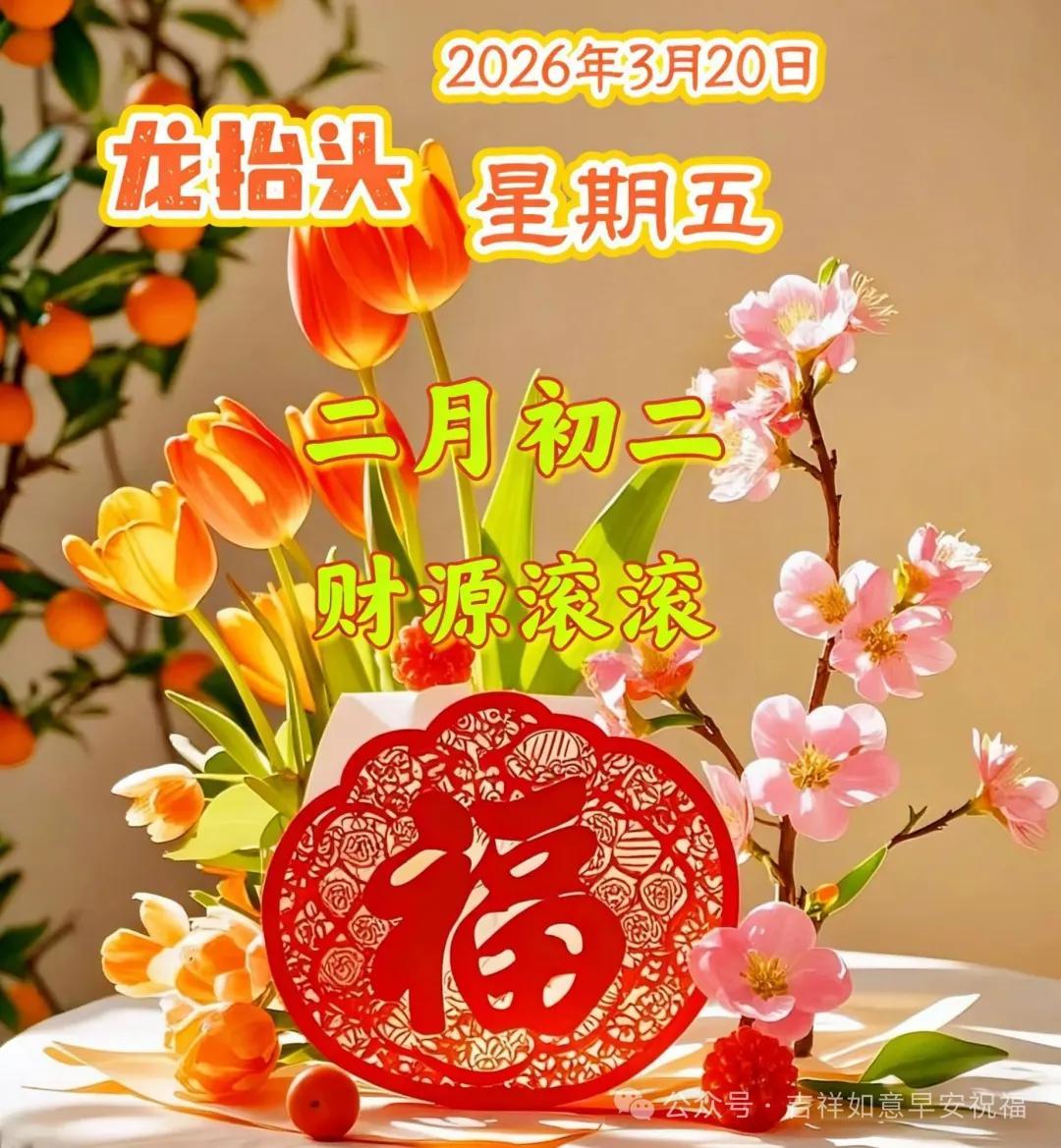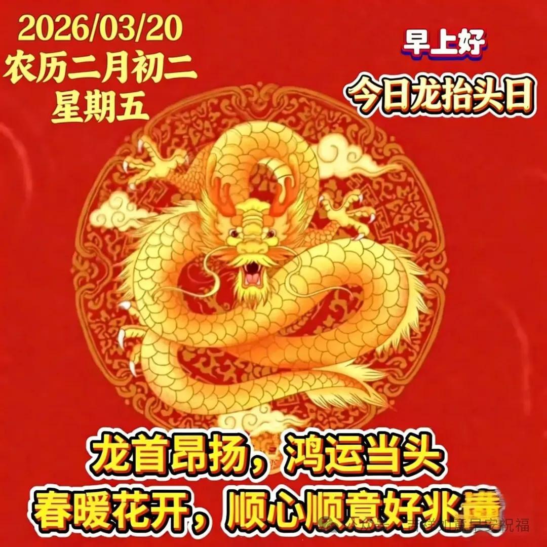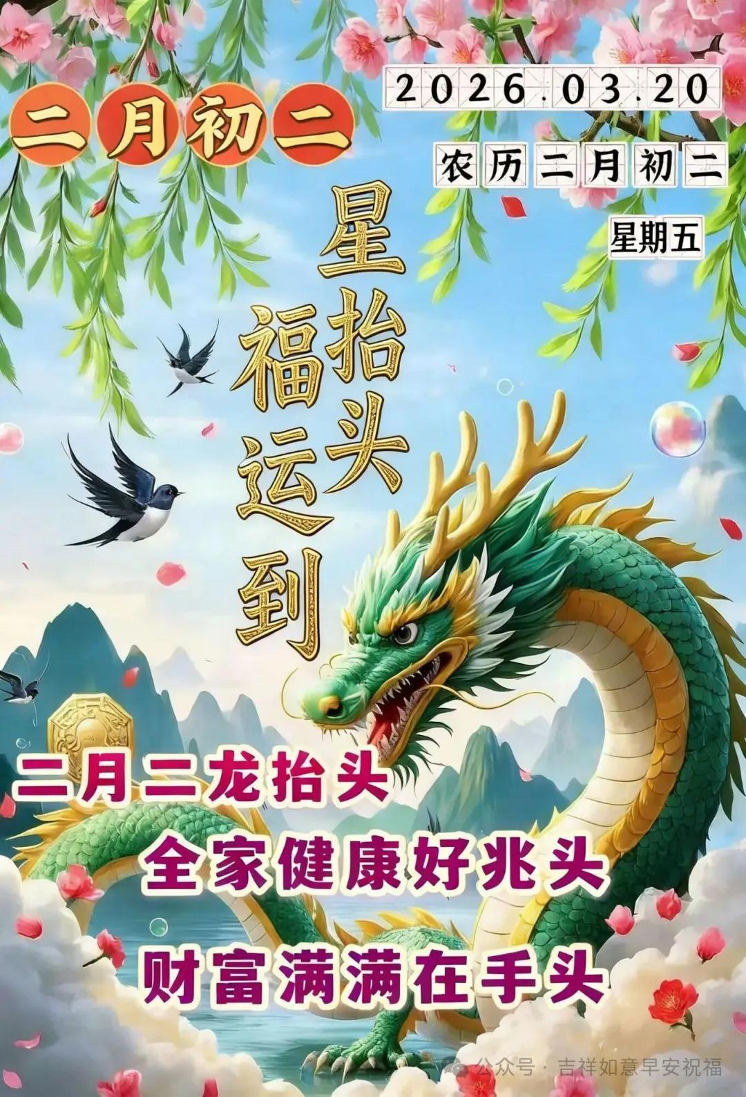二月初二,龍抬頭。一抬頭,豐收在望好兆頭。二抬頭,福祿壽喜全都有。三抬頭,煩惱黴運全溜走;四抬頭,成功事業攥你手;五抬頭,步步順利爭上游;六抬頭,幸福健康到永久。龍抬頭日,祝你一年好運從頭到尾!
