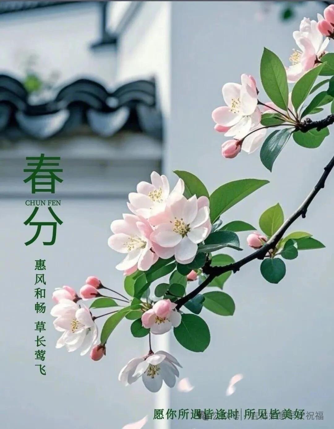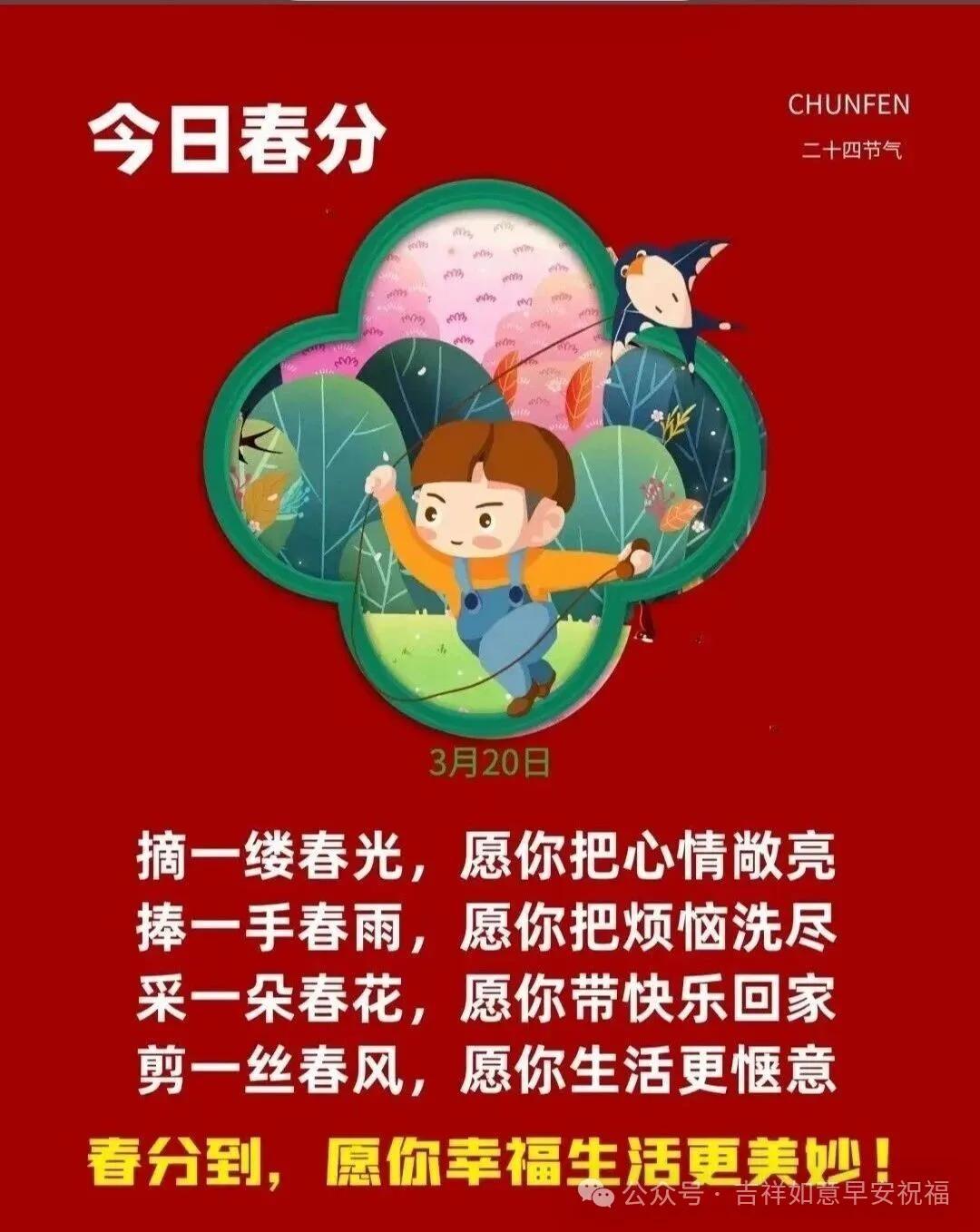 春分到,春風揚,吹綠枝頭好風光,吹紅花兒滿庭芳,吹走煩惱心歡暢,☀吹去憂愁福滿堂,吹來好運常相伴,吹送祝福暖心房,春分,願你喜樂常伴,福氣綿長。