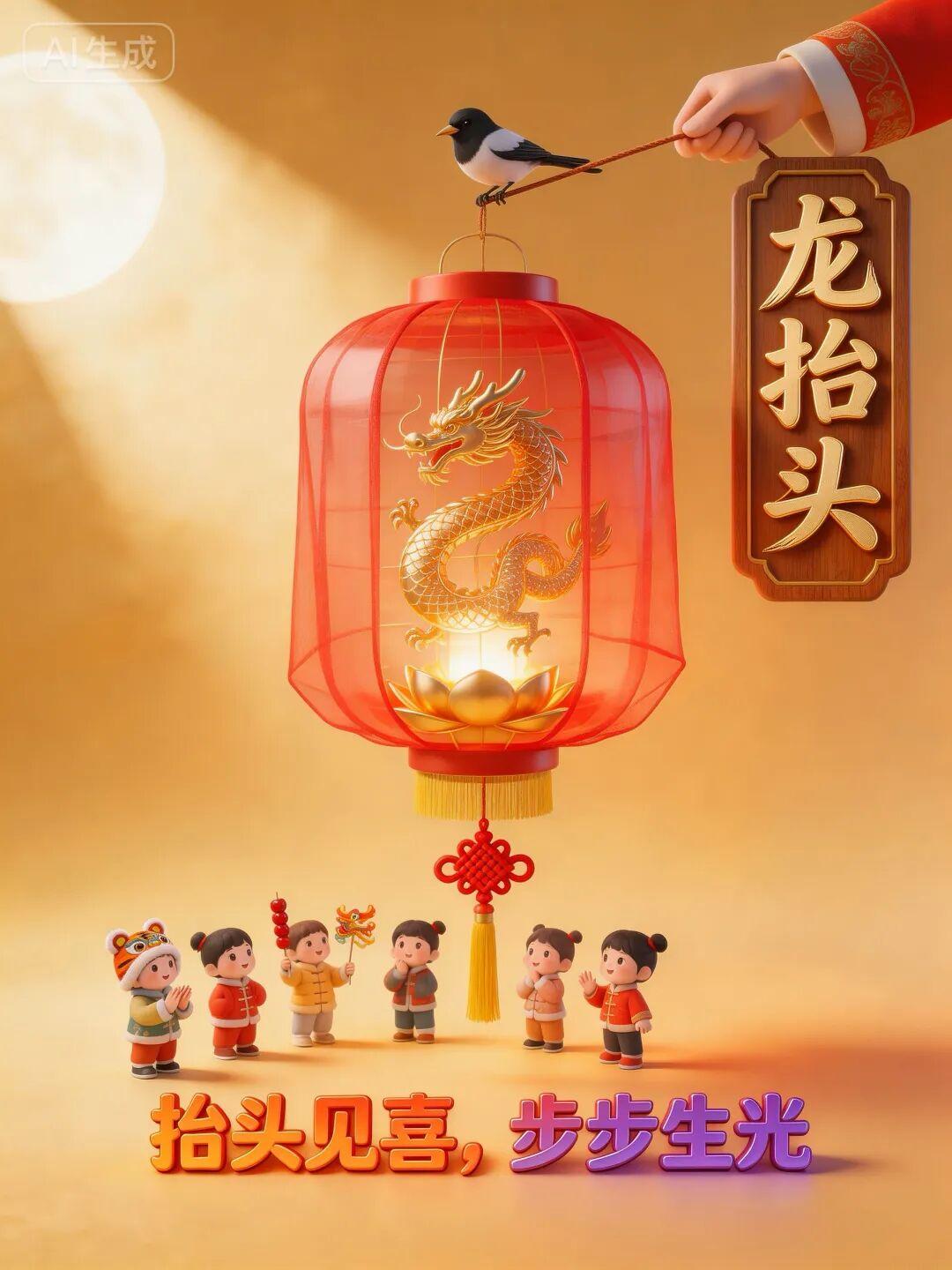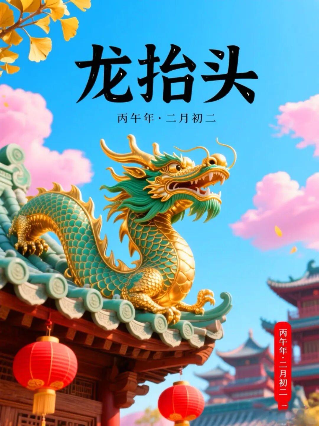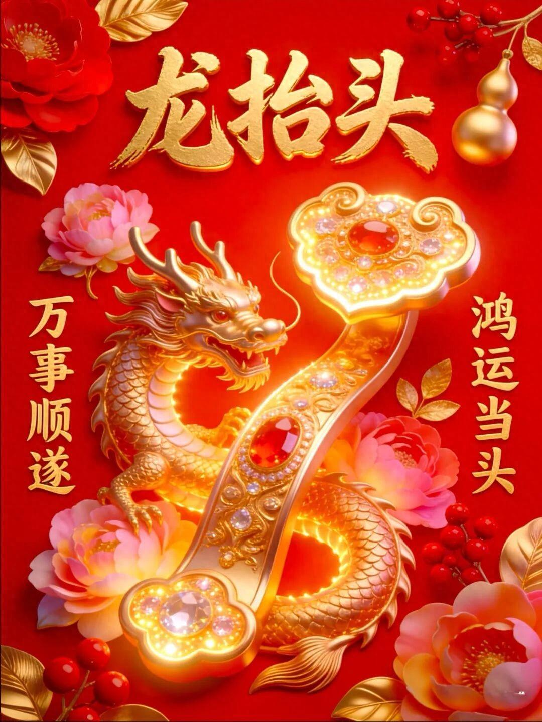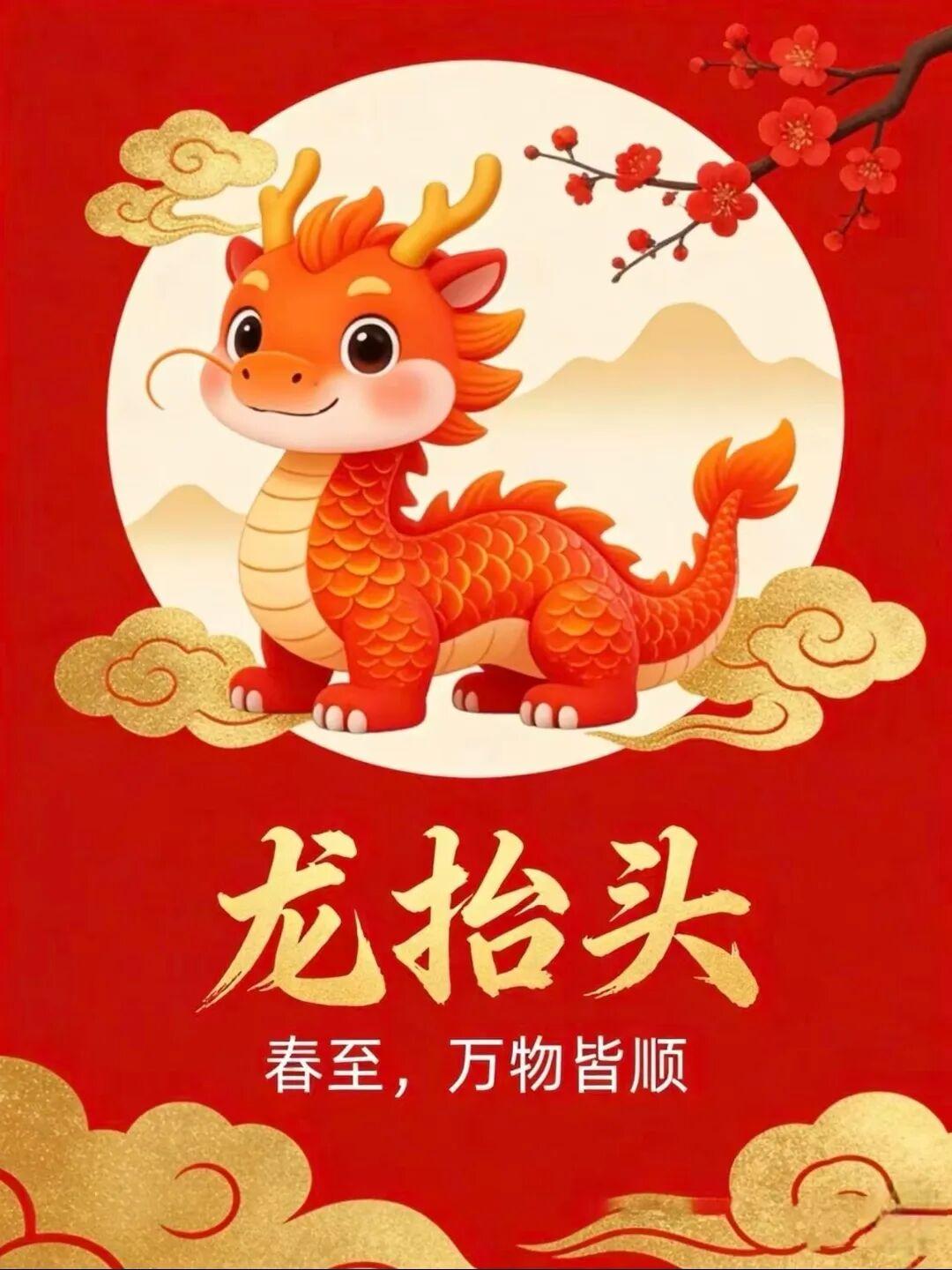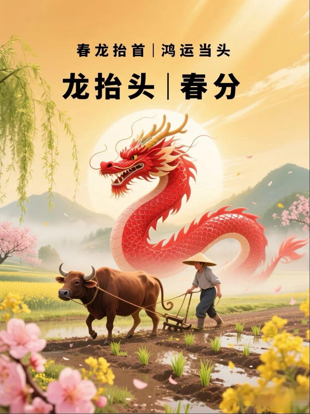 春分喜遇龍抬頭,福滿人間花滿柔。日子蒸蒸皆勝意,萬事可期不用愁。晝夜平分好運留,福袋金龍伴花前,龍運護你前程順,歲歲平安樂無憂。