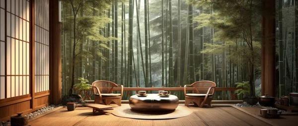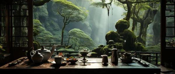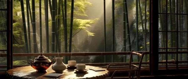 筆直參天的樹下,前有孩童嬉戲,屋舍內獨享飲酒,