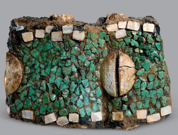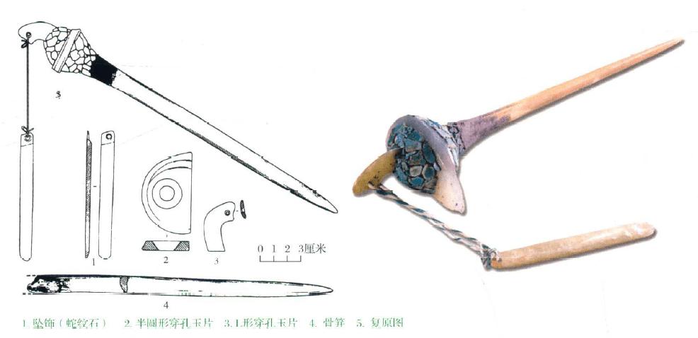 她身上的配飾也非常的嚴謹,頭上戴的髮簪、右手綠松石腕飾、左臂的玉璧環及胸前璜形玉佩等配飾都是以陶寺遺址出土文物爲原型,佩戴方式也嚴格依據出土位置及相關研究成果。圖|綠松石鑲嵌腕飾