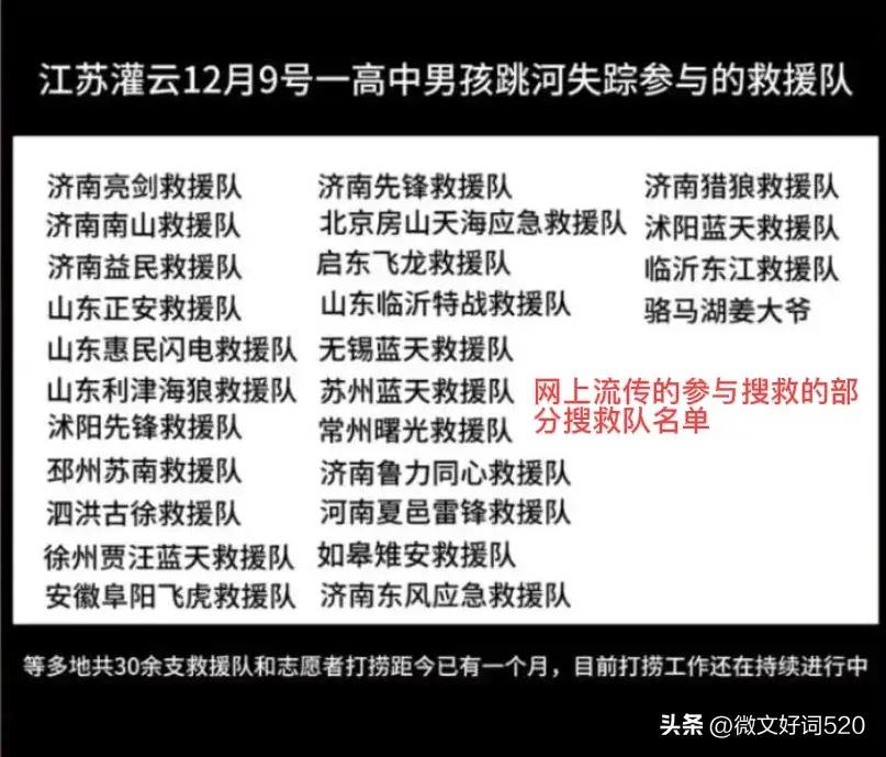 在張同學跳河失聯之後,灌雲縣的相關部門高度重視,踐行“人民至上,生命之上”。盡心盡責,積極地組織尋找失聯的張新偉同學。迅速啓動應急措施:從全國各地組織了40餘支專業的搜救隊(含公益專業搜救隊),聯合組成了一支龐大的搜救隊開展搜救工作。同時,也邀請了省搜救專家實地指導搜尋工作。