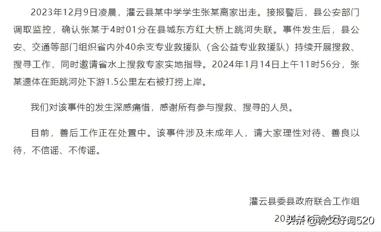 2023年12月上旬, 江蘇省連雲港灌雲縣發生了一件讓人痛心的事。 有一位18歲的讀高三的張新偉同學,於2023年12月9日的凌晨離家出走,留遺書後墜河失聯。最後家人尋找無果報警求助。