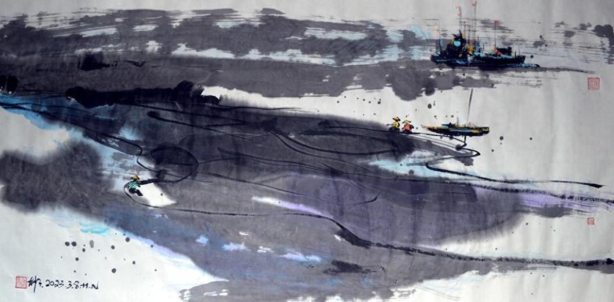灘塗、雲彩、船隻、漁網,零零總總地灑落在畫面上,顯得又偶然又必然,偶然性的是點綴,必然卻是點綴的生機盎然,大有起死回生之感。在墨韻意猶未盡之時,色彩的靈動、深墨的定奪,儘管你淡墨渲染飄飛,線條形態逶迤婉轉,都給予視覺上的多與少、大與小及點線面的繪畫構築了一種整體的形式感,至於美不美、精煉不精煉那就各花入各眼了。