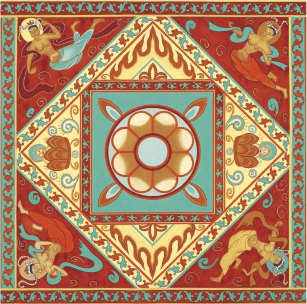 有學者認爲,“天圓地方”的概念可能是從東、南、西、北四個方向座標系的體系延伸出來的,並不是指大地四邊有四條明確的邊框作爲界限。秦簡《魯久次問數於陳起》中,陳起用具體的數字描述了一個“地方三重,天員(圓)三重”的由方和圓相互套嵌的宇宙模型。圖 | 隋·莫高窟401窟,復原的蓮花伎樂藻井 | 來源於澎湃新聞隨着時間推移,漢武帝在長安城郊設立祭壇,形制爲三重圓壇,這可以被看做是後世圜丘天壇的雛形。至東漢,確立了南郊圜丘祭天、北郊方壇祭地的郊壇制度,“天圓地方”的理念真正成了描述宇宙形狀的俗語,深入人心。
