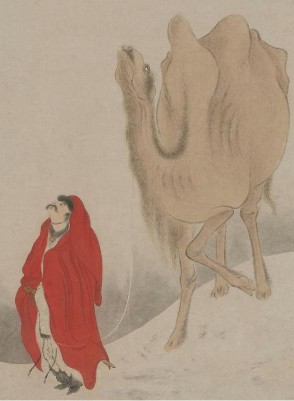 這幅雪景圖的色彩也是相當有特點。它有別於常見的水墨雪景,十分注重色彩搭配。在大片的潔白雪景中,駱駝的淺褐色、人物的鮮紅色顯得格外抓眼,冷暖色調的對比非常考究,同時設色雅緻古樸。