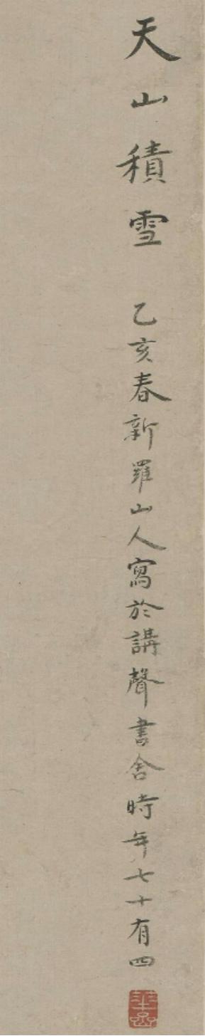 在《天山積雪圖》的右側,華嵒自題道:“天山積雪。乙亥春,新羅山人寫於講聲書舍,時年七十有四。”下鈐“華巖”,右下角鈐“空塵詩畫”印。