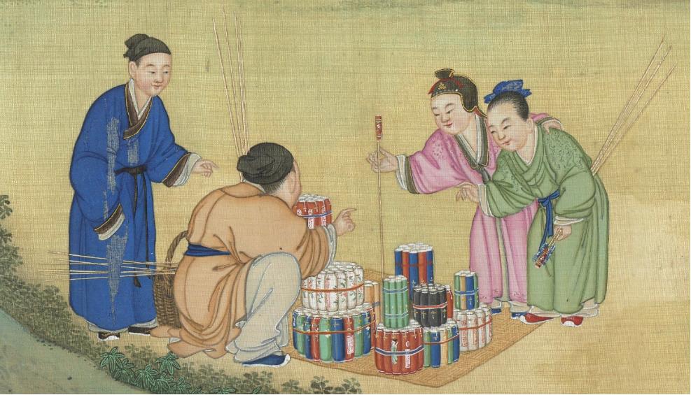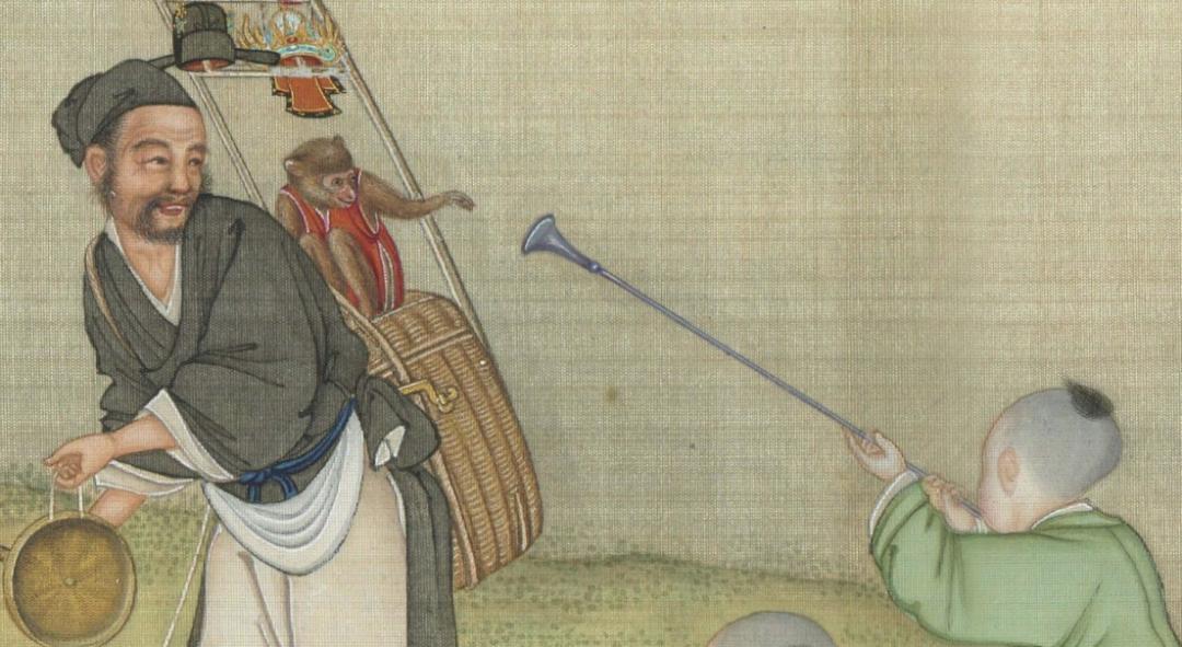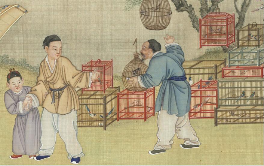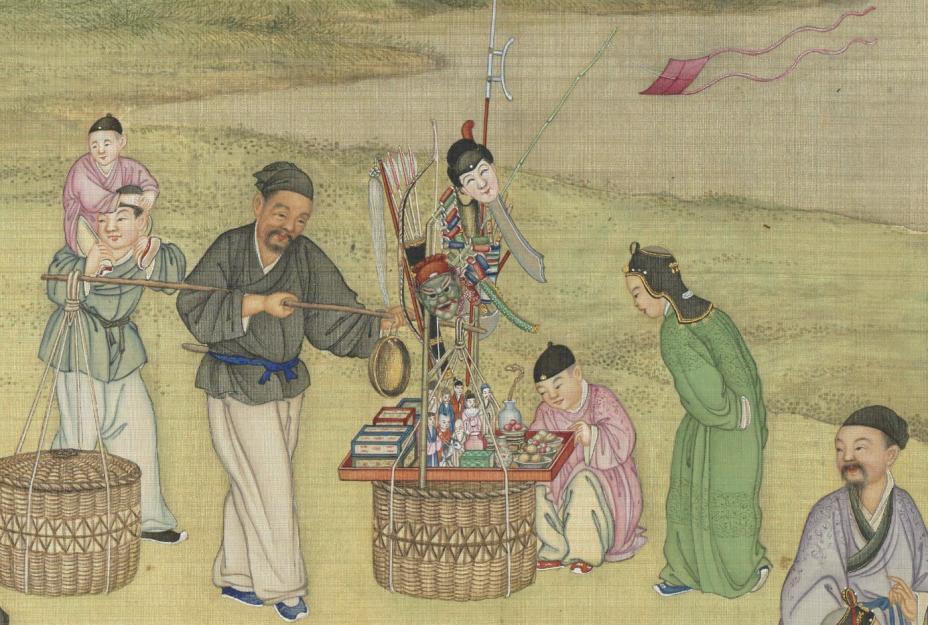 《太平春市圖》是丁觀鵬奉旨所作的一幅描繪新春市集的畫卷。畫卷中,鄉民們互相作揖問好,兩側形形色色的攤販摩肩擦踵,有賣爆竹、太平鼓等新春“限定”玩具的,也有賣花果鳥蟲的,還有些耍猴戲、演傀儡戲的雜耍藝人。