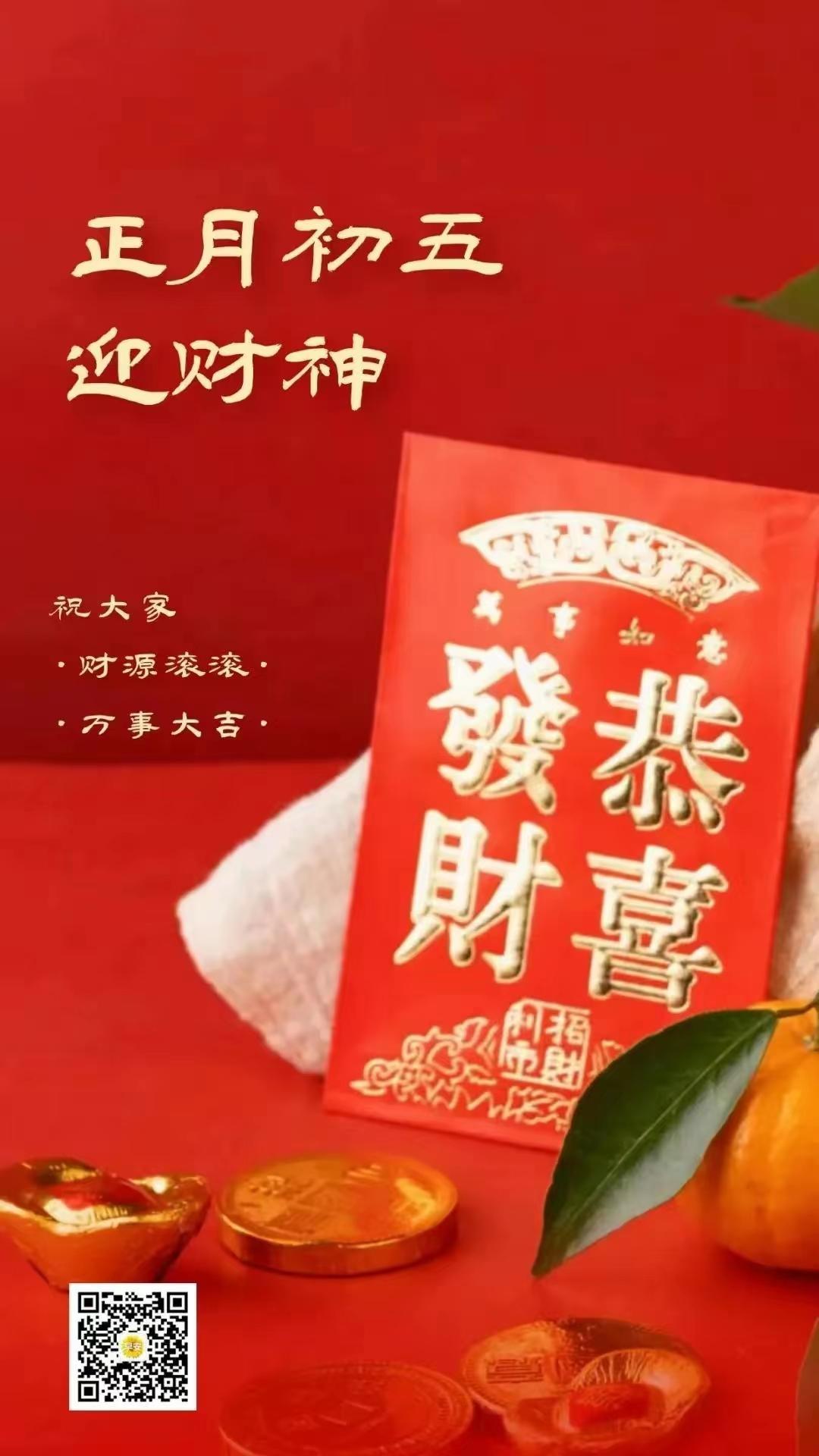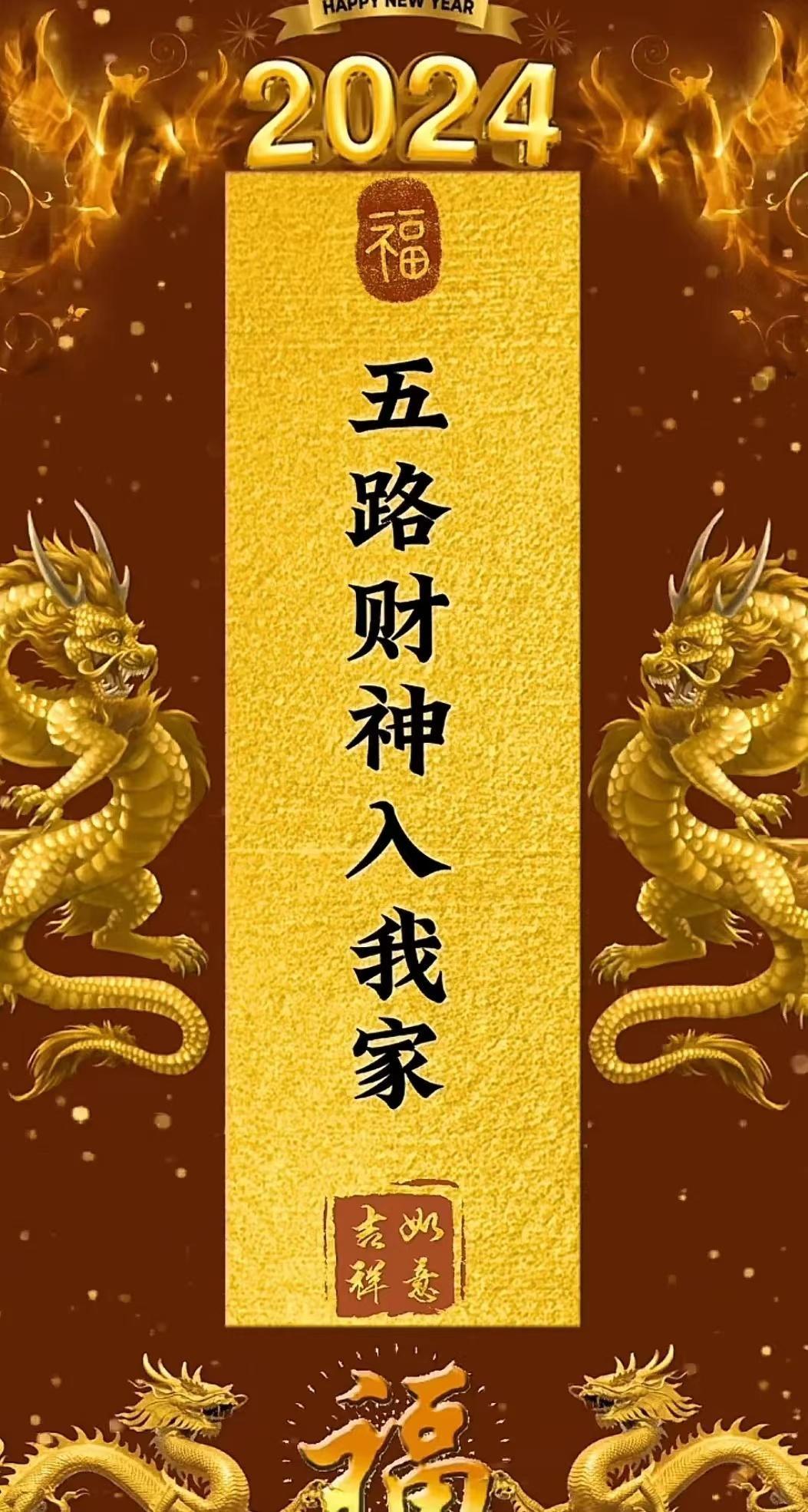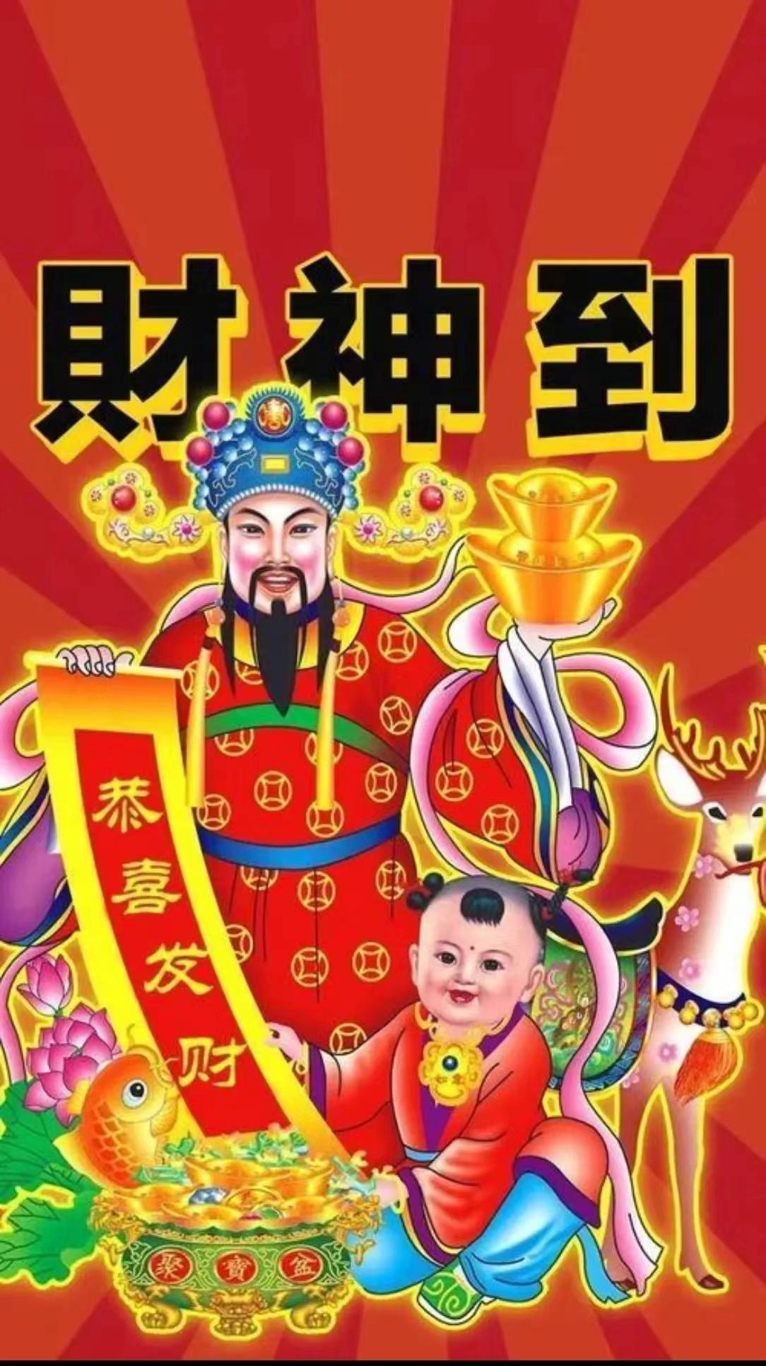恭迎五路財神:一賜福、二賜財,賜來金銀抱滿懷;三賜吉、四賜祥,賜來如願傍身旁;善門開,笑門開,善因笑果財自來,恭迎五路財神進我家門來!我要發財!願我全家財運亨通,八方來財,財源滾滾。