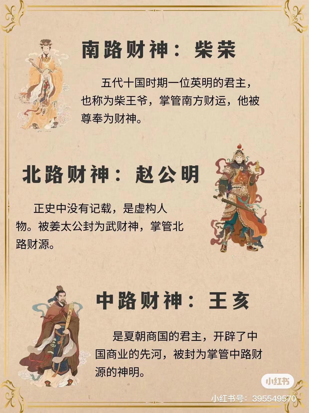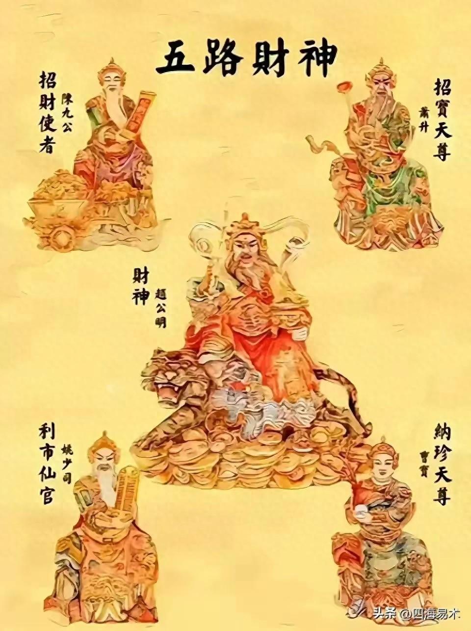 五路財神是:東路財神—比干;西路財神—關羽;南路財神—柴榮;北路財神—趙公明;中路財神—王亥;
