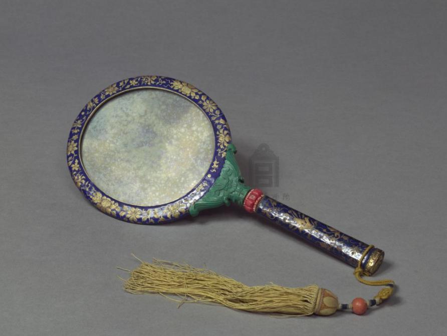 圖|清·藍透明琺琅描金喜字把鏡,通長27.9釐米,寬12.5釐米|現藏於故宮博物院
