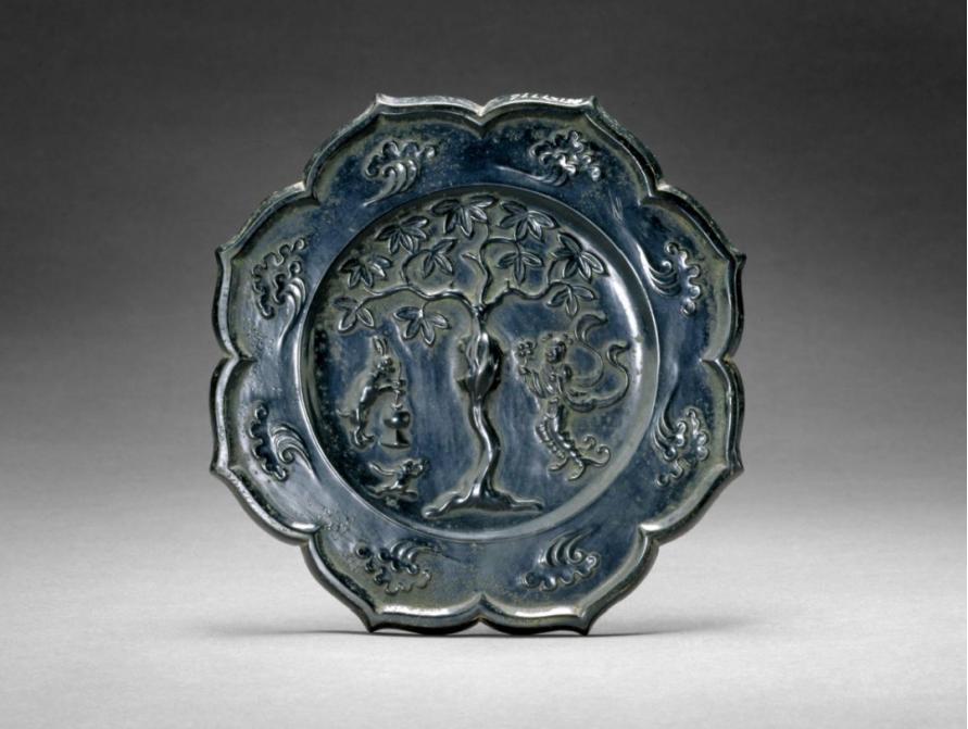 這面月宮鏡爲八瓣菱花形,紋飾凸雕月宮圖,中間爲枝繁葉茂的桂樹,兩側分別爲嫦娥起舞與玉兔搗藥。